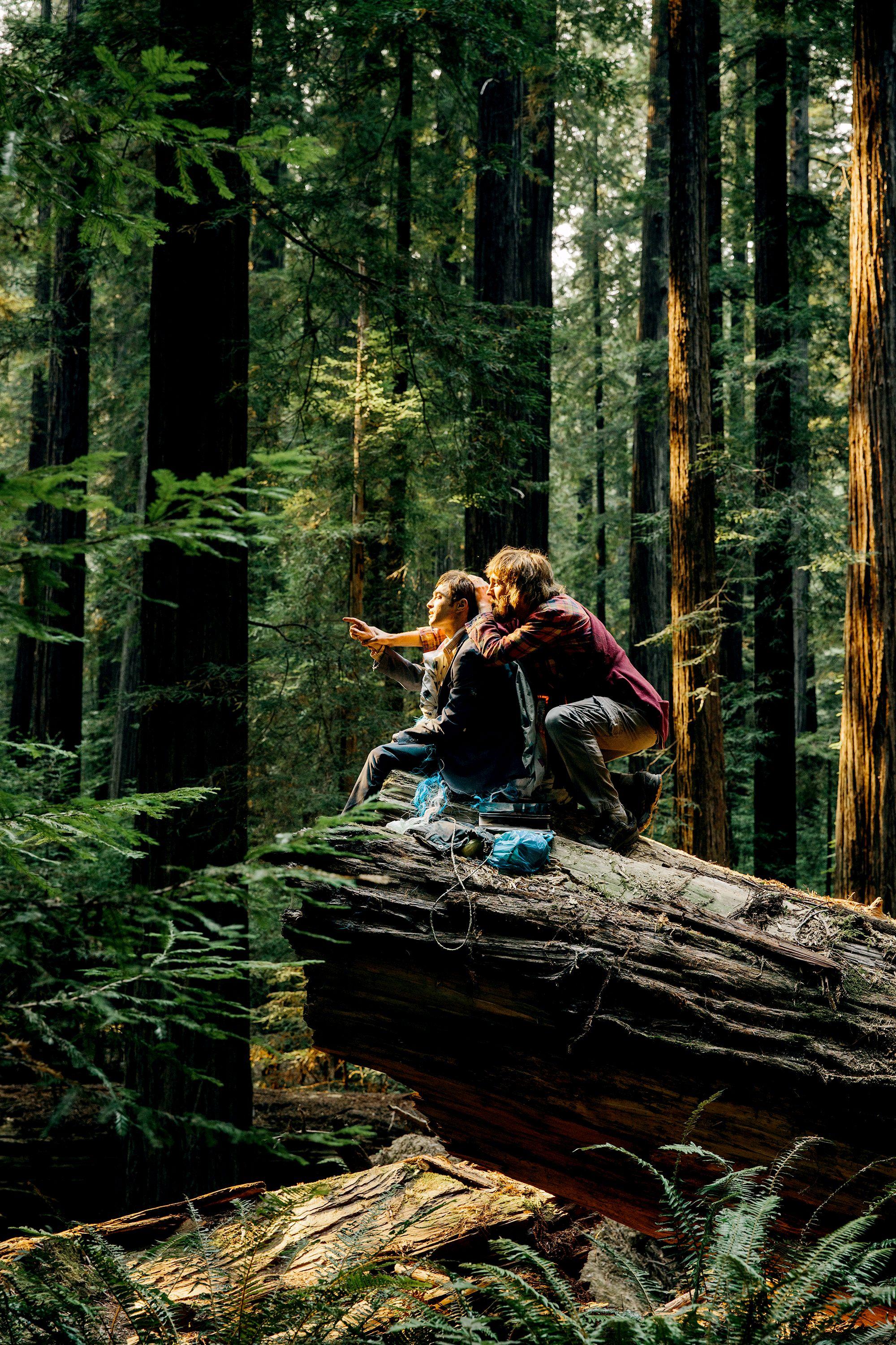 Description: Two people sitting on a log in the woods pointing at something in the distance with trees in the background.