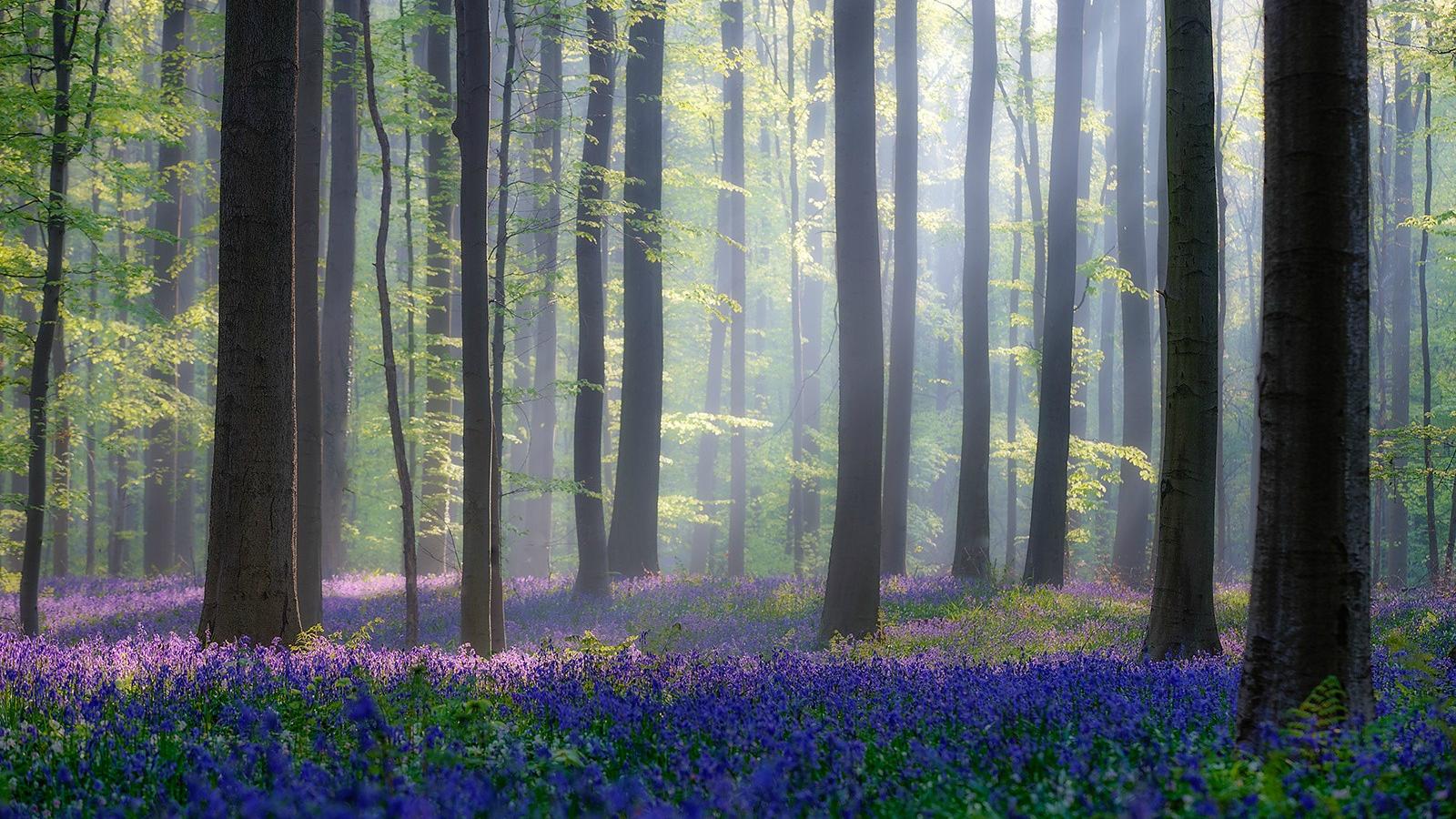 Description: A forest filled with lots of trees and purple flowers in the woods with fog coming from the trees and the ground.