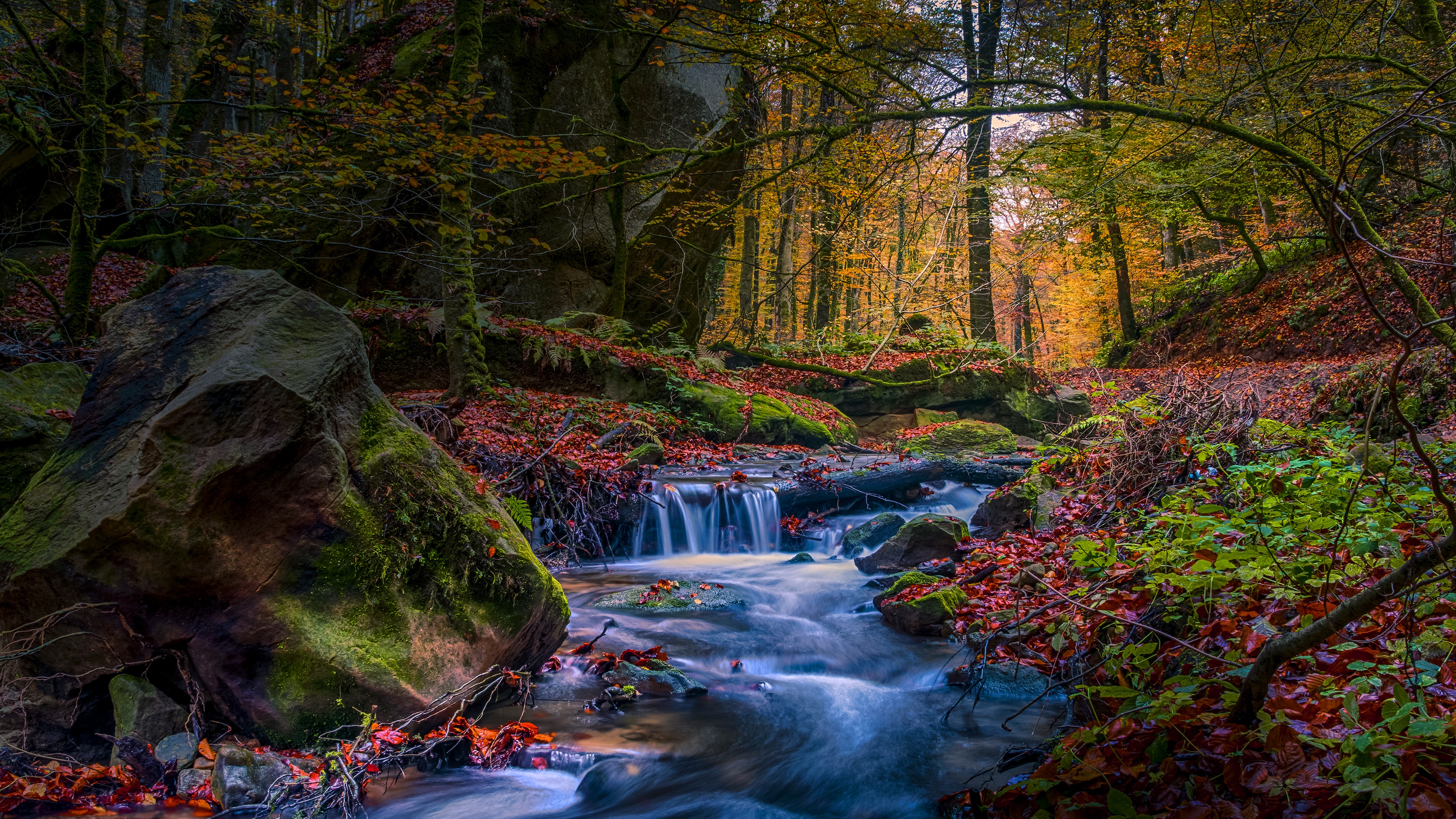 Description: A stream running through a forest filled with trees and leaves covered rocks and trees with red leaves on them.