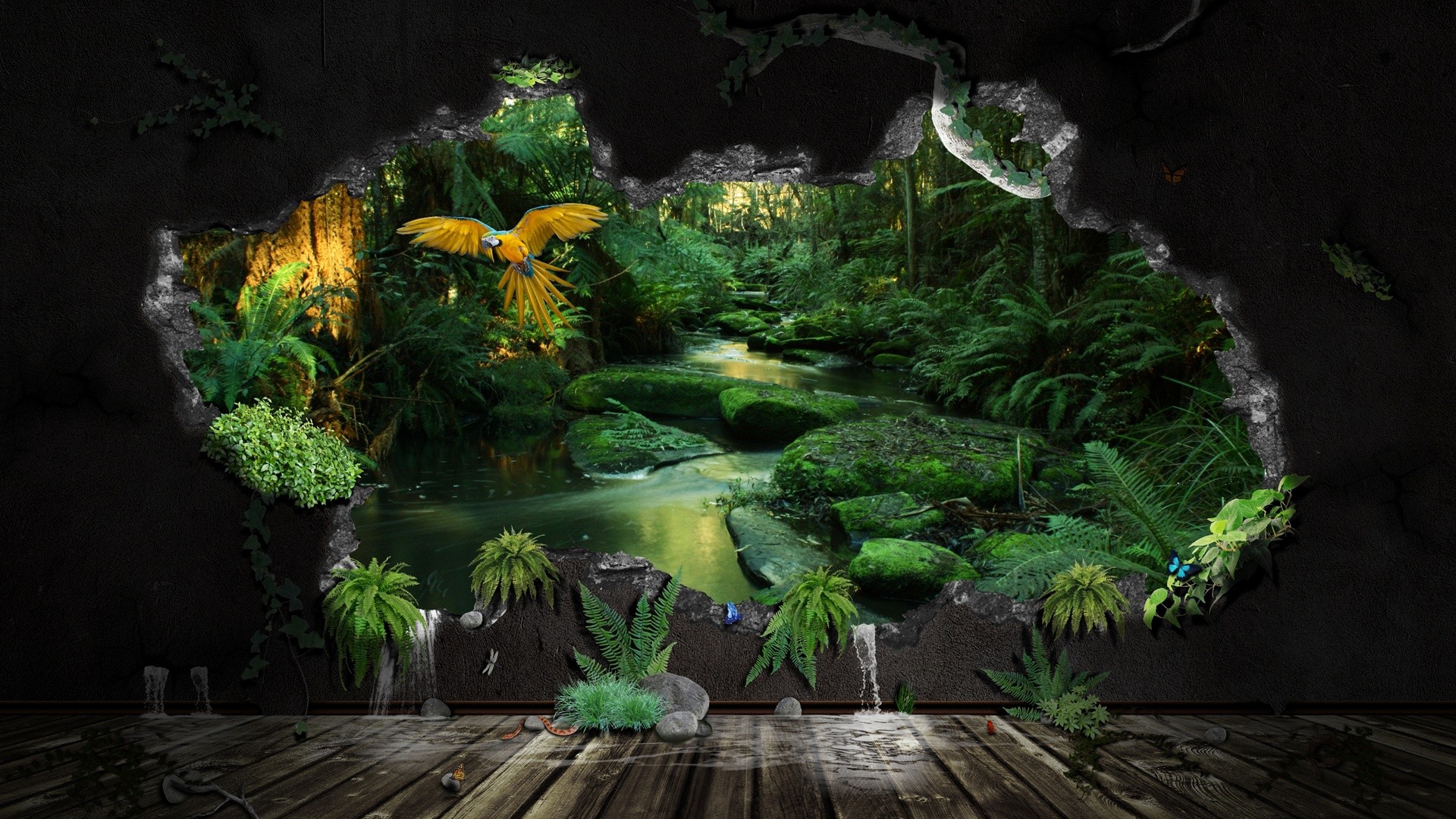 Description: A picture of a forest with a river and trees in it's center and a wooden floor in front of it.