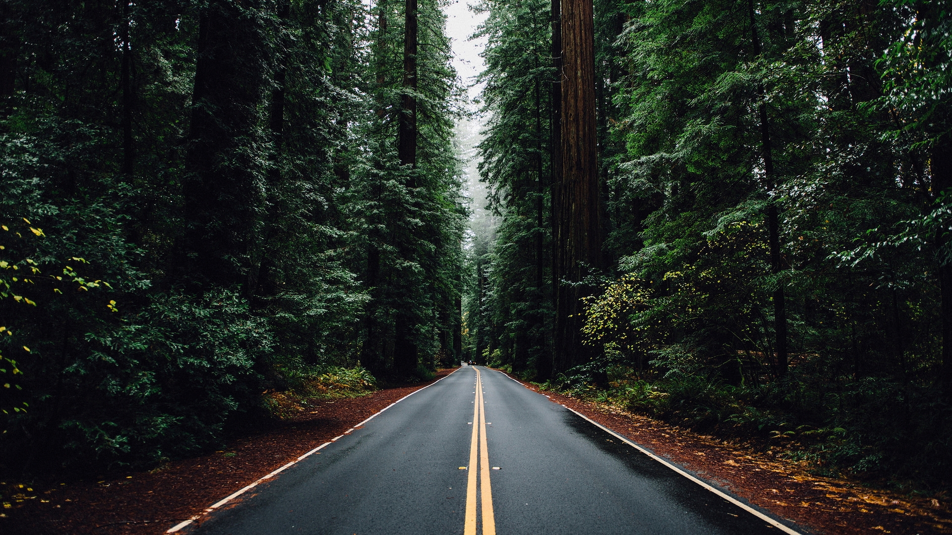Description: A road in the middle of a forest with tall trees on both sides of it and a yellow line on the road.