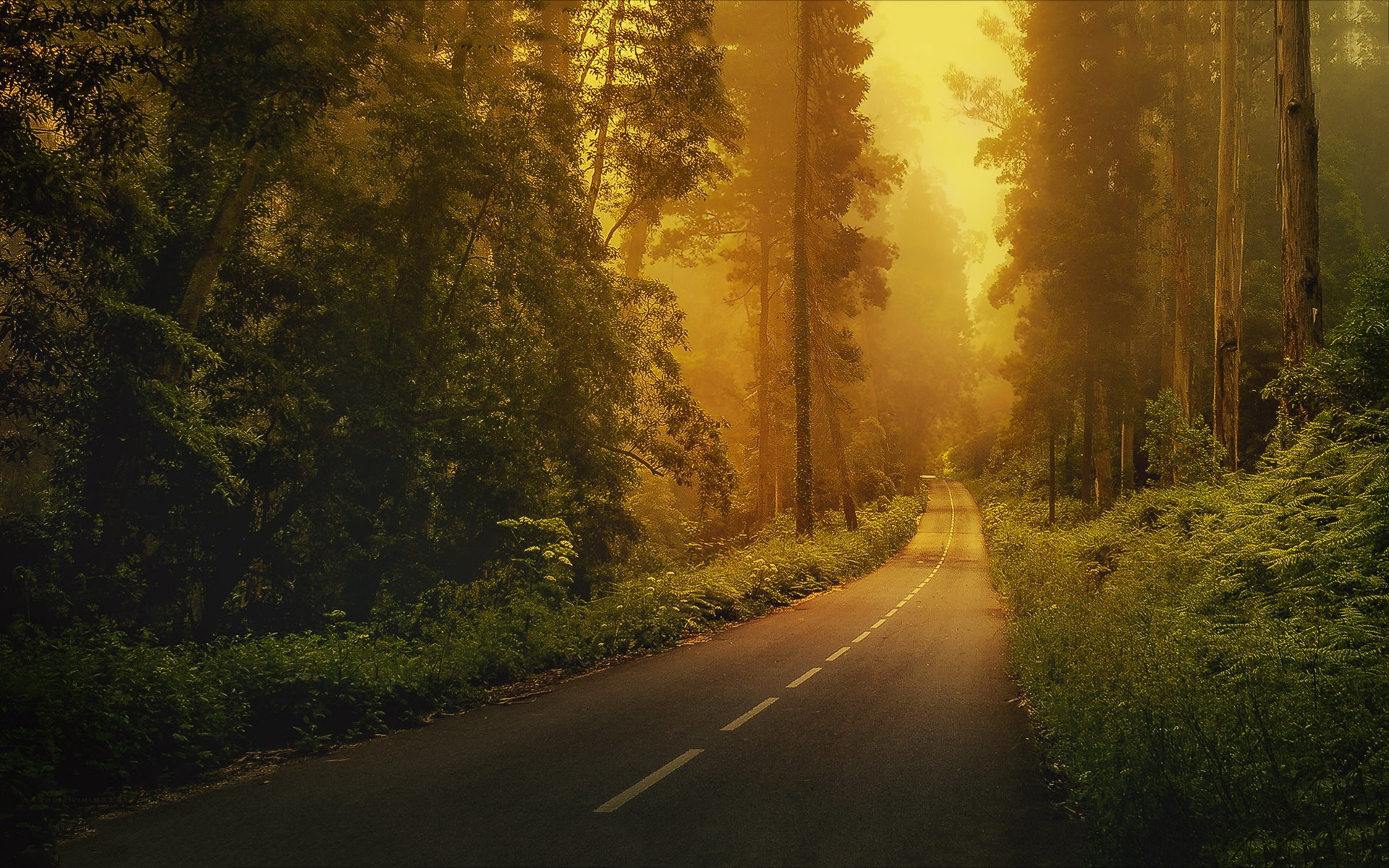 Description: A road in the middle of a forest with trees on both sides of it and a yellow sky above.