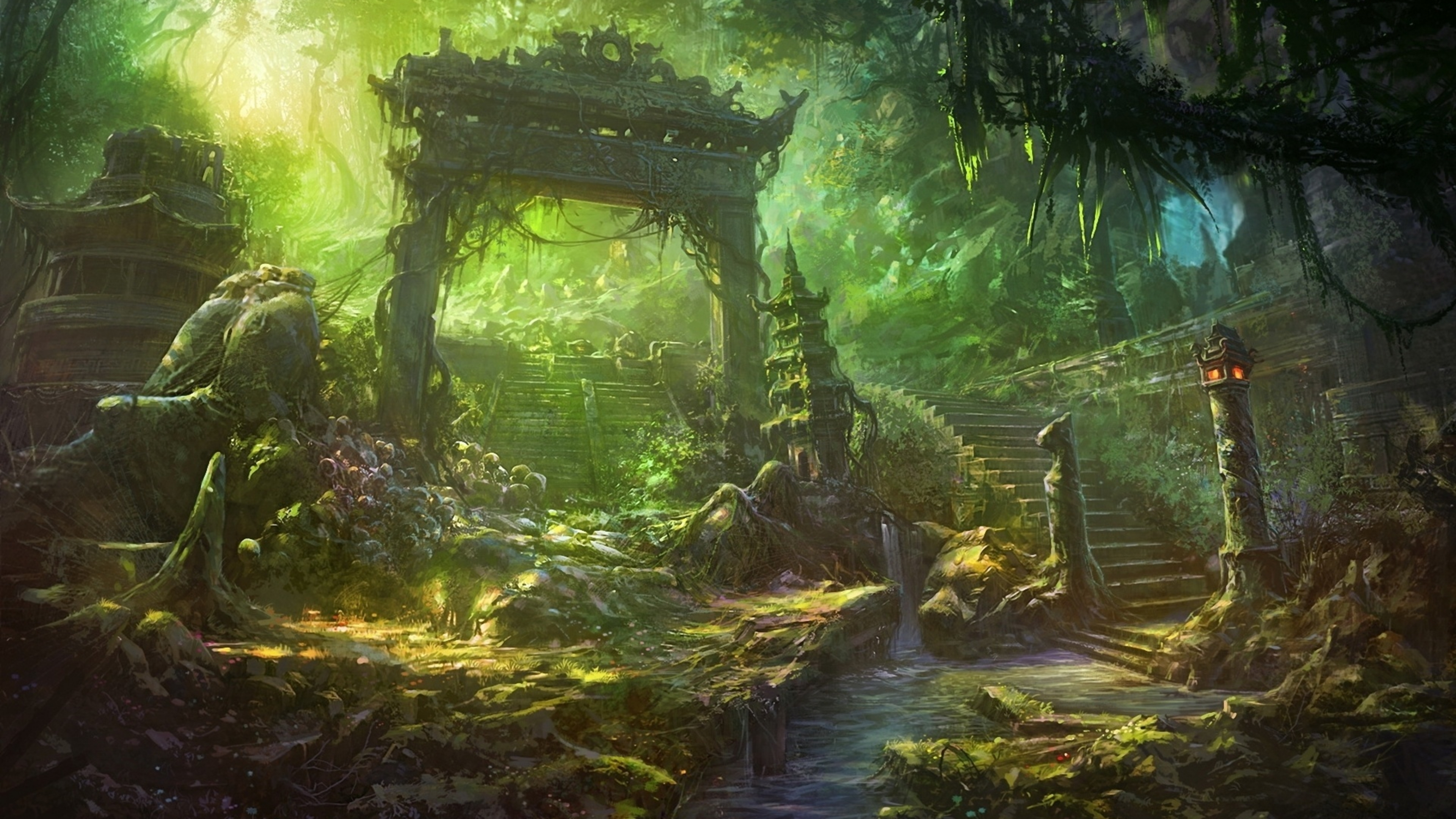 Description: A painting of a forest with a lot of trees and stairs and a man sitting on a bench in the middle.