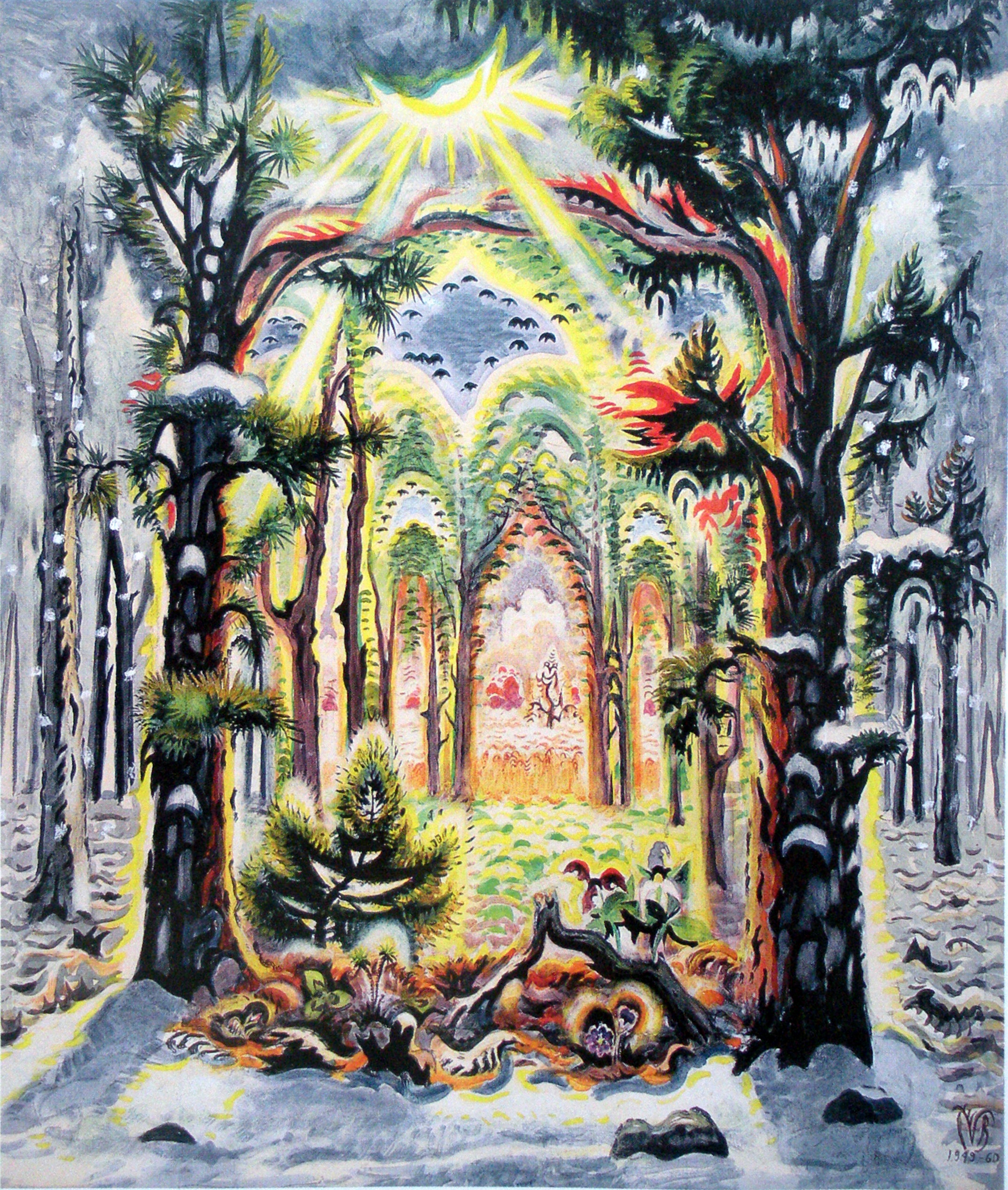Description: A painting of a forest with a sun shining through the trees and a person in the distance in the middle of the painting.