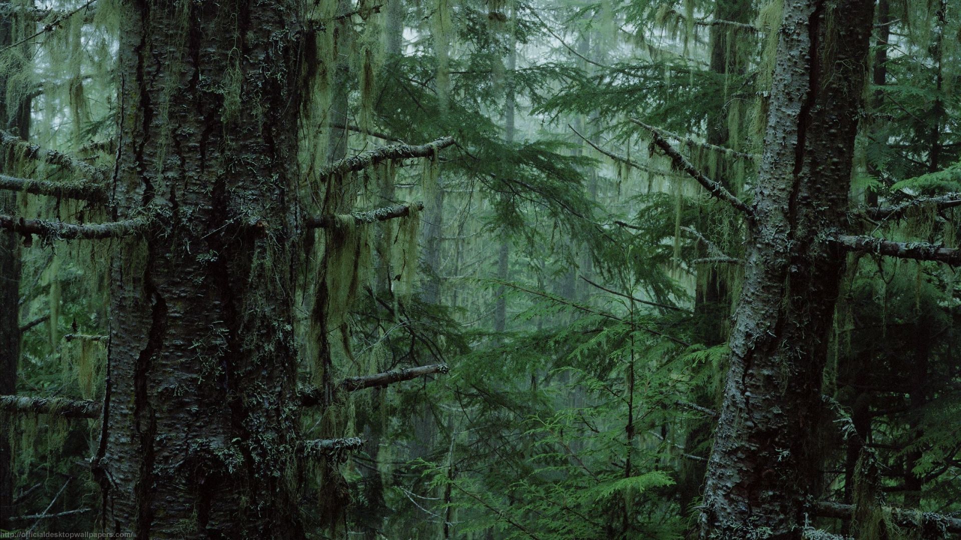 Description: A forest filled with lots of tall trees covered in mossy growth and mossy growth on the trees.