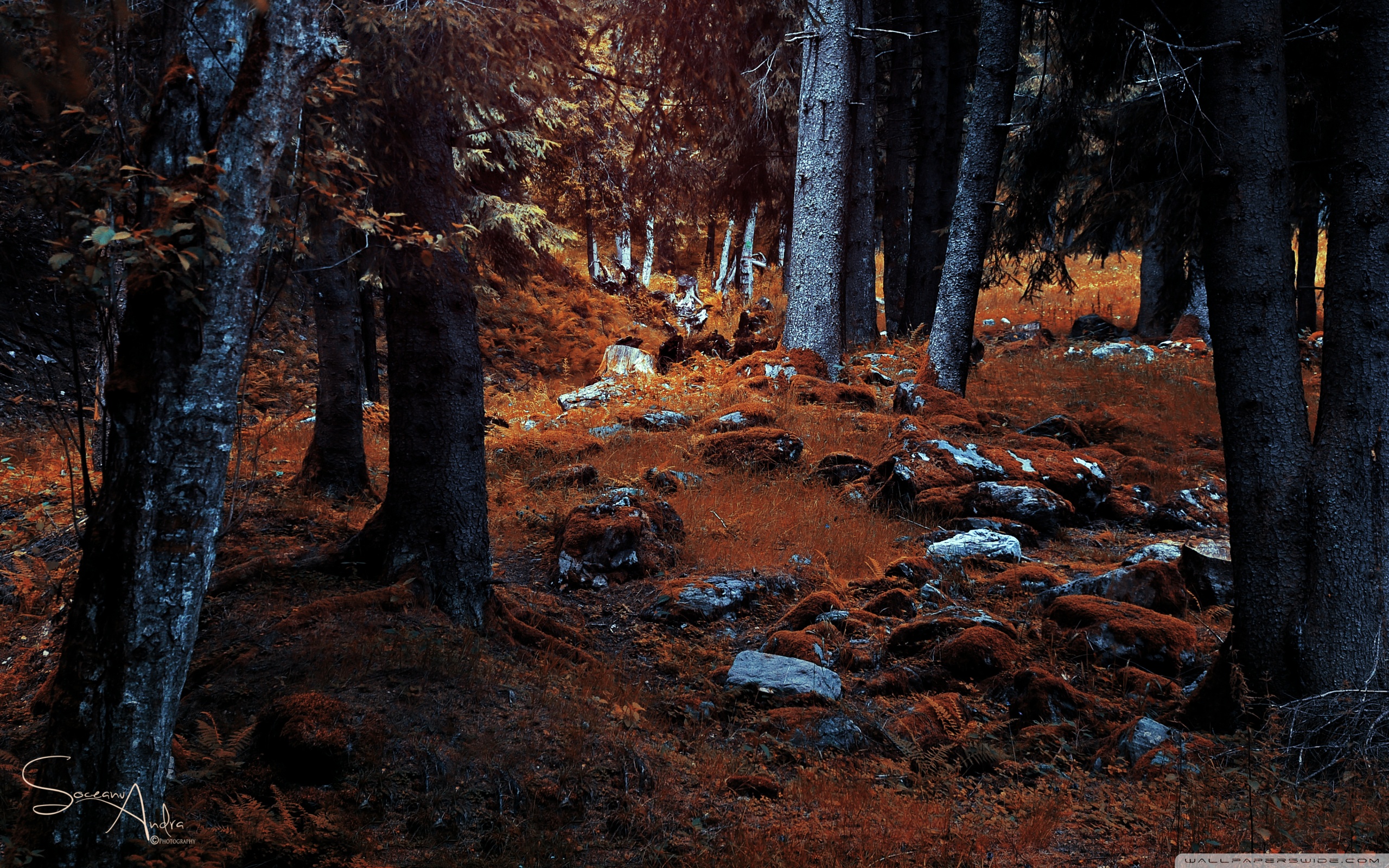 Description: A forest with rocks and trees in the foreground and a trail in the background with a few trees.