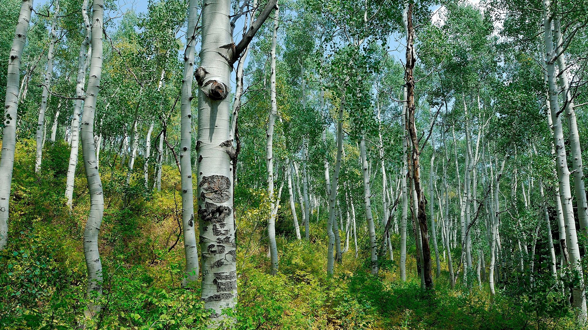Description: A forest filled with lots of tall trees and green grass on the ground and a blue sky above it.