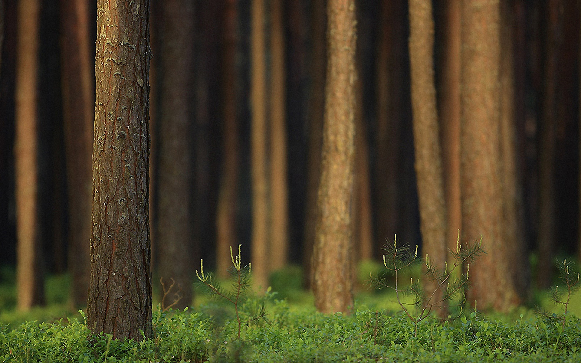 Description: A forest with a lot of tall trees and green grass on the ground and a few bushes on the ground.