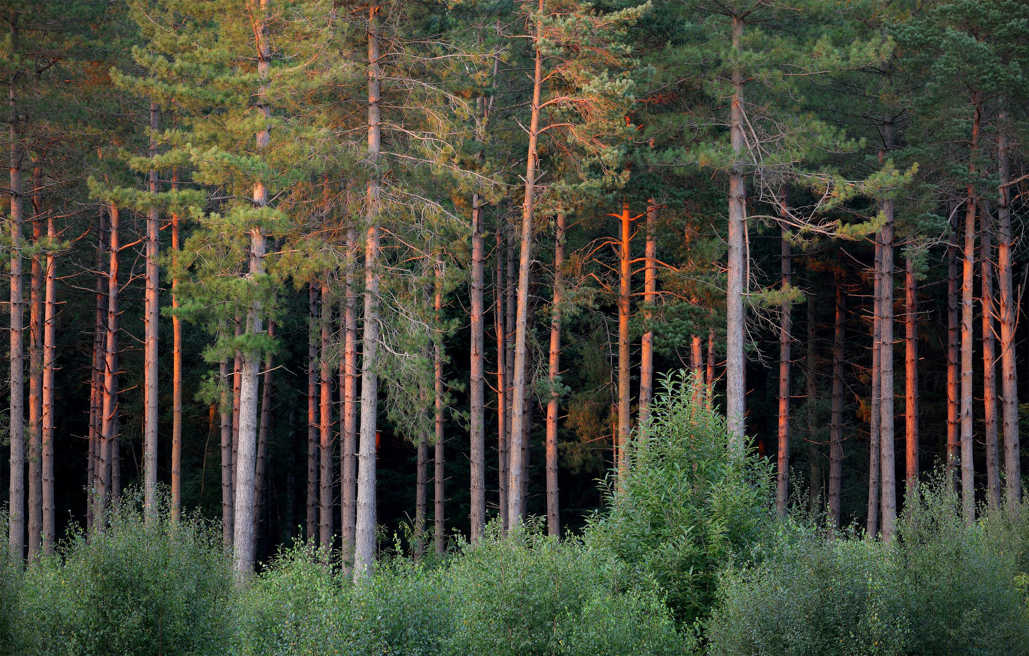 Description: A forest filled with lots of tall trees and green leaves on the ground and a red light shining on the trees.