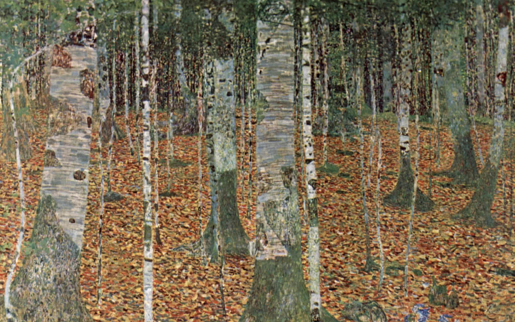 Description: A painting of a forest with lots of trees and leaves on the ground and a person walking in the woods.