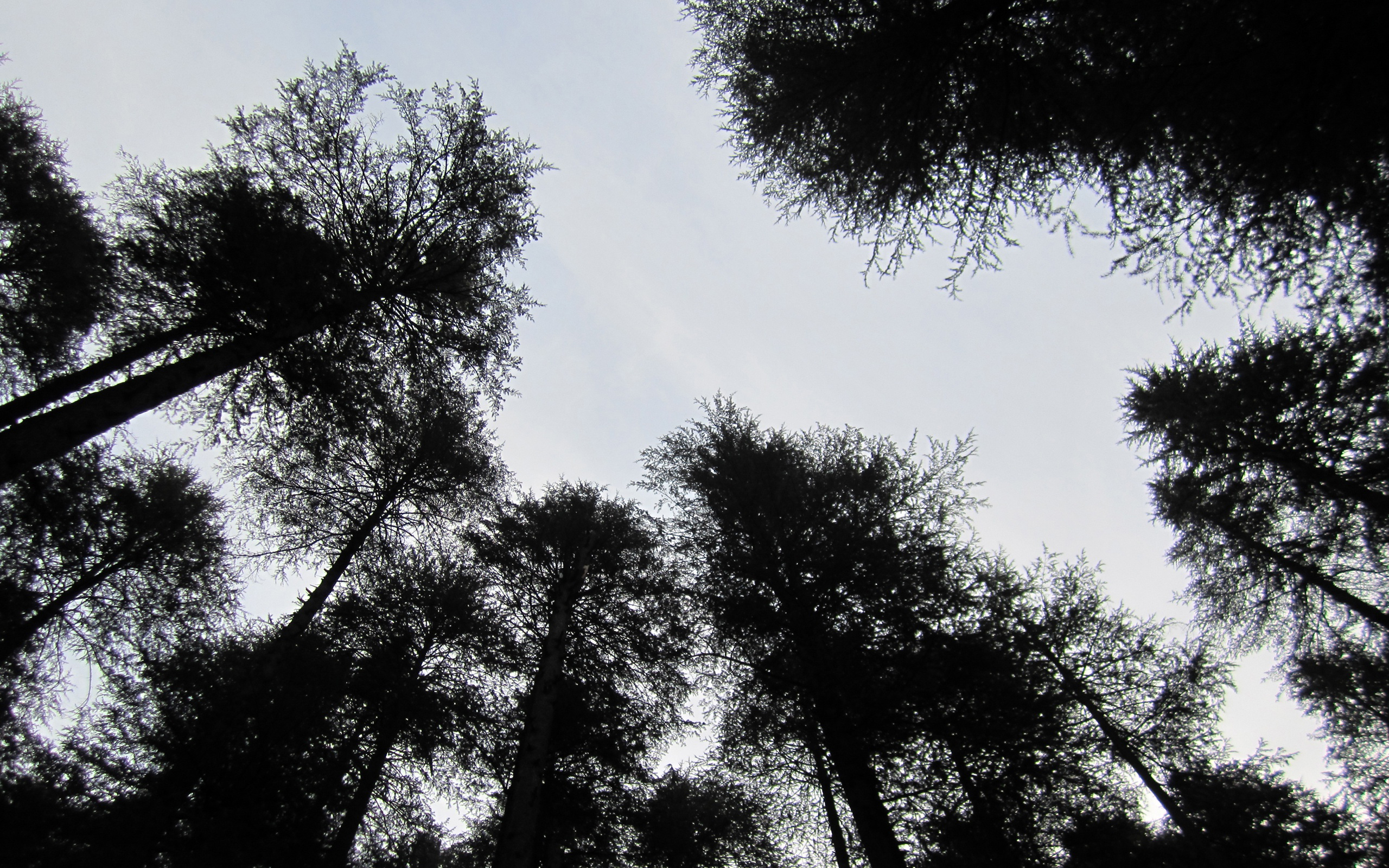 Description: A view of the tops of trees from below in a forest area with a blue sky in the background.
