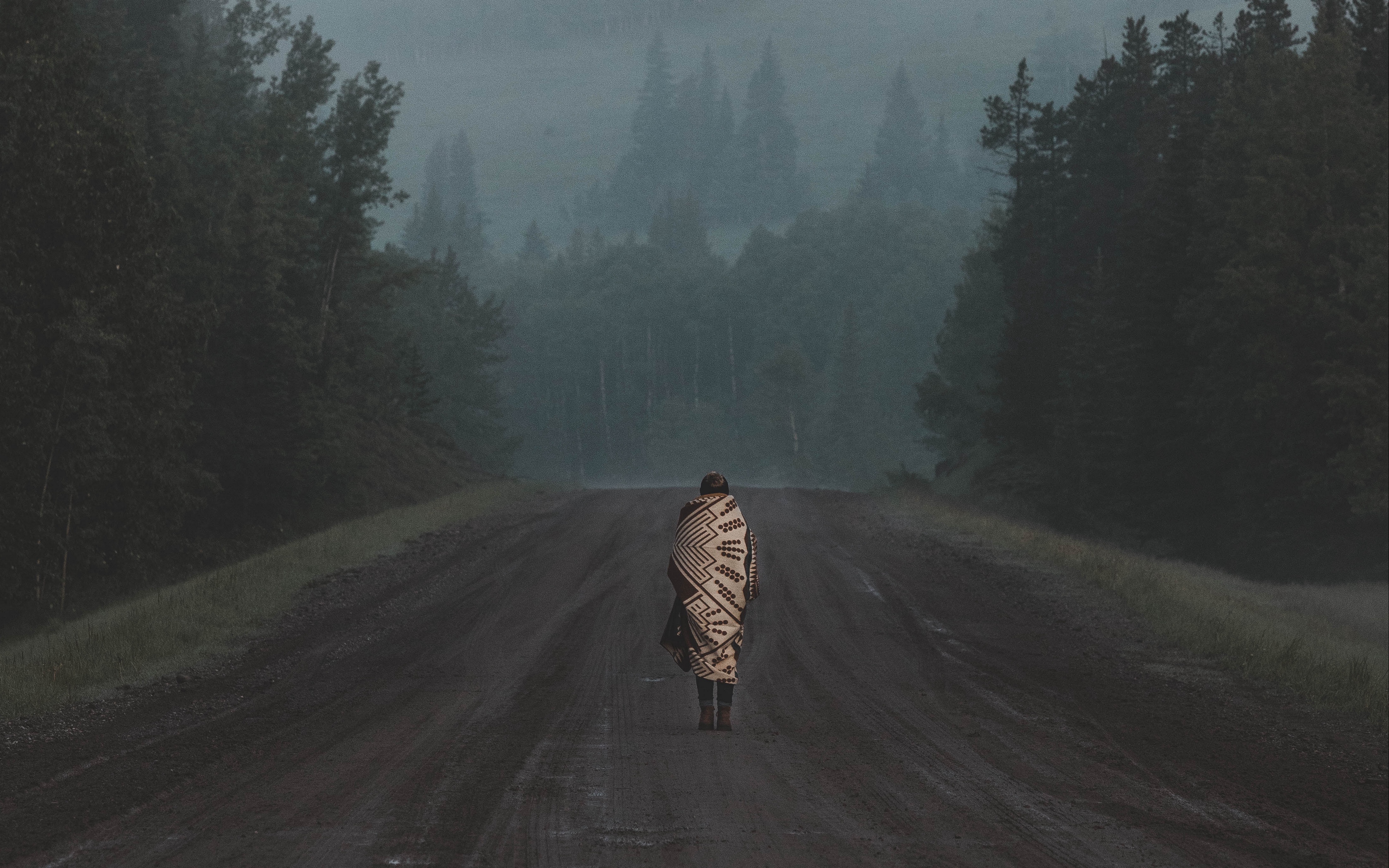 Description: A person walking down a dirt road in the middle of a forest with a blanket on their back and trees in the background.