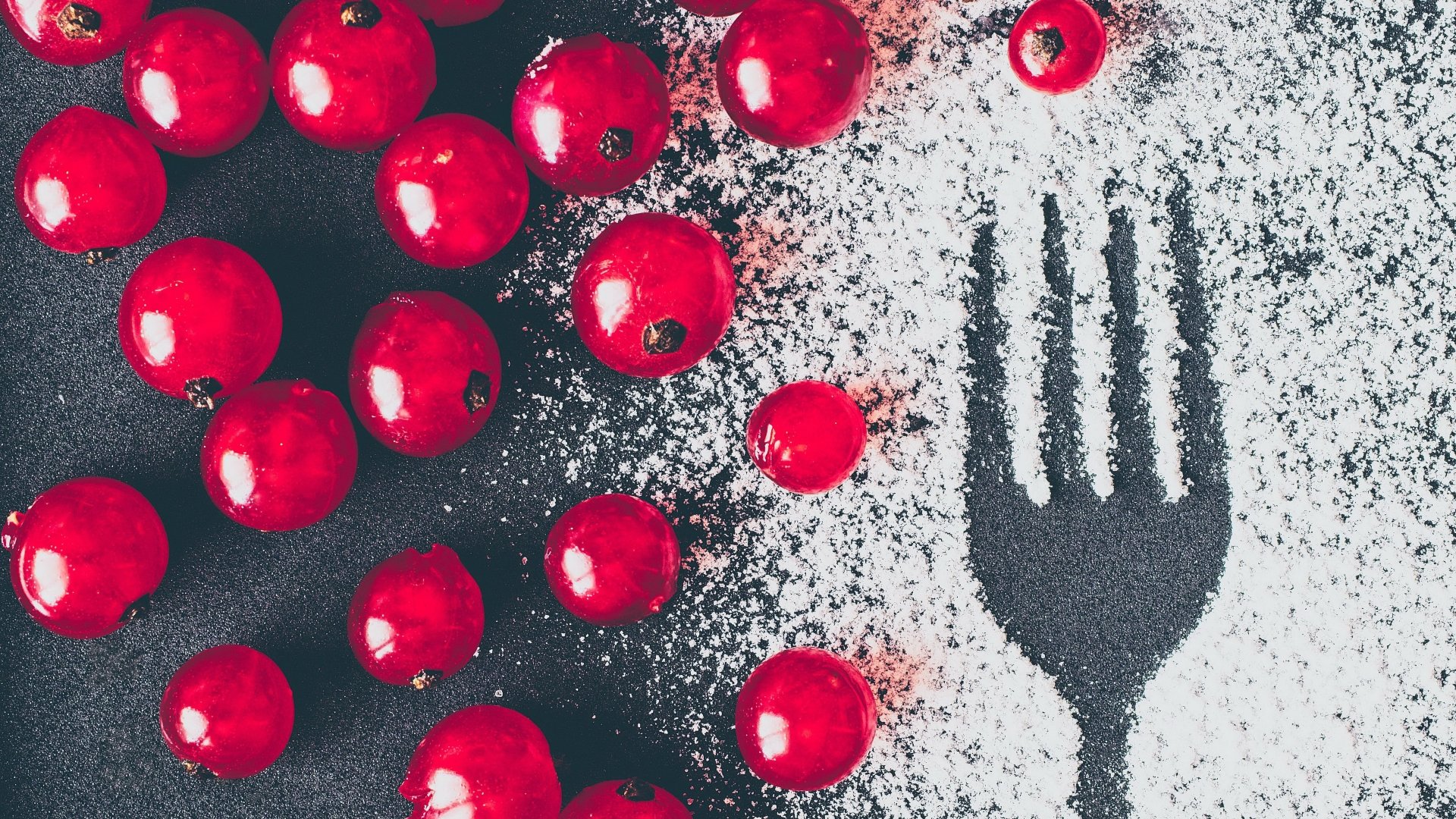 Description: A fork and a pile of red apples on a table with powdered sugar on it and a fork.