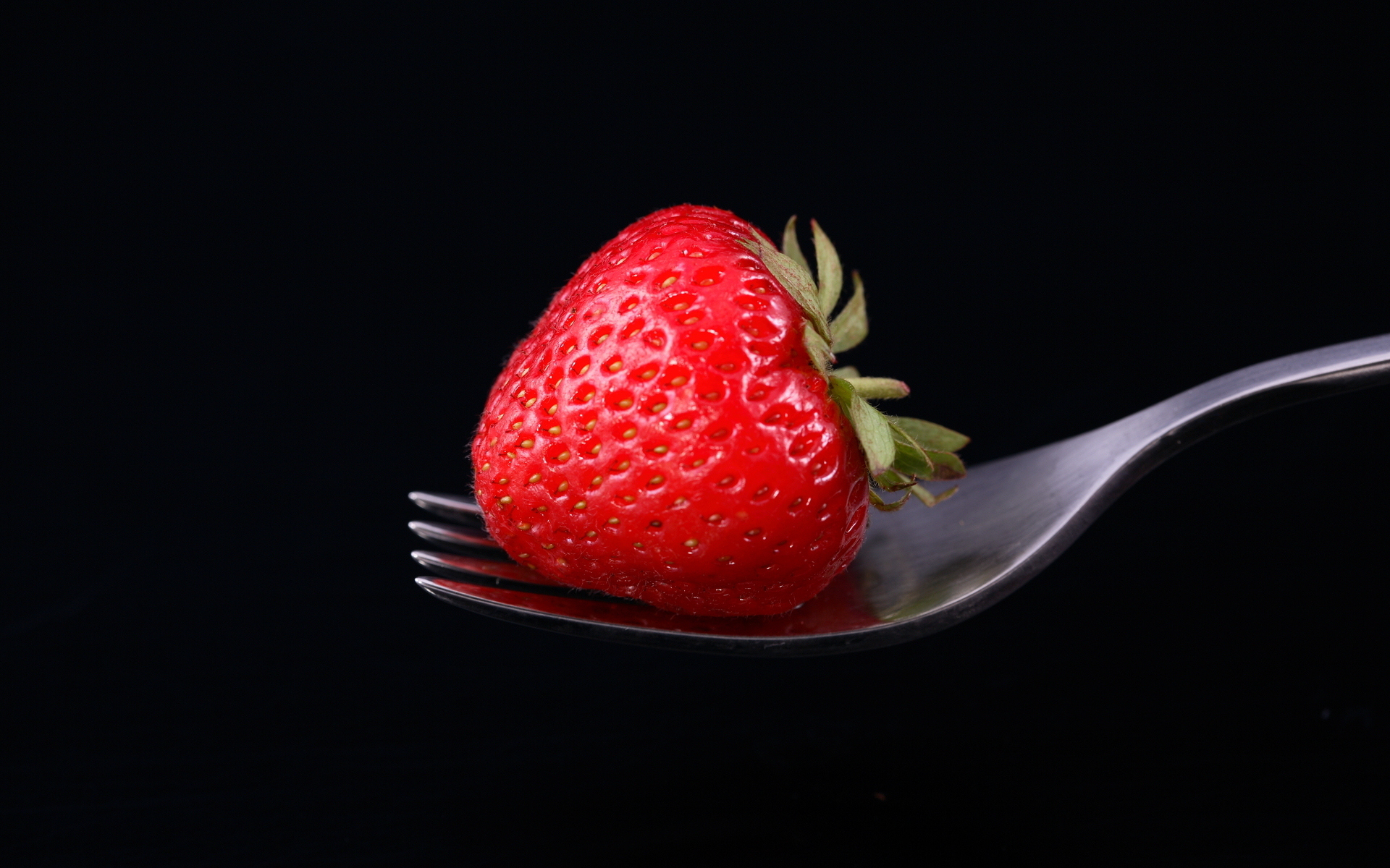 Description: A close up of a fork with a strawberry on it's end and a black background behind it.