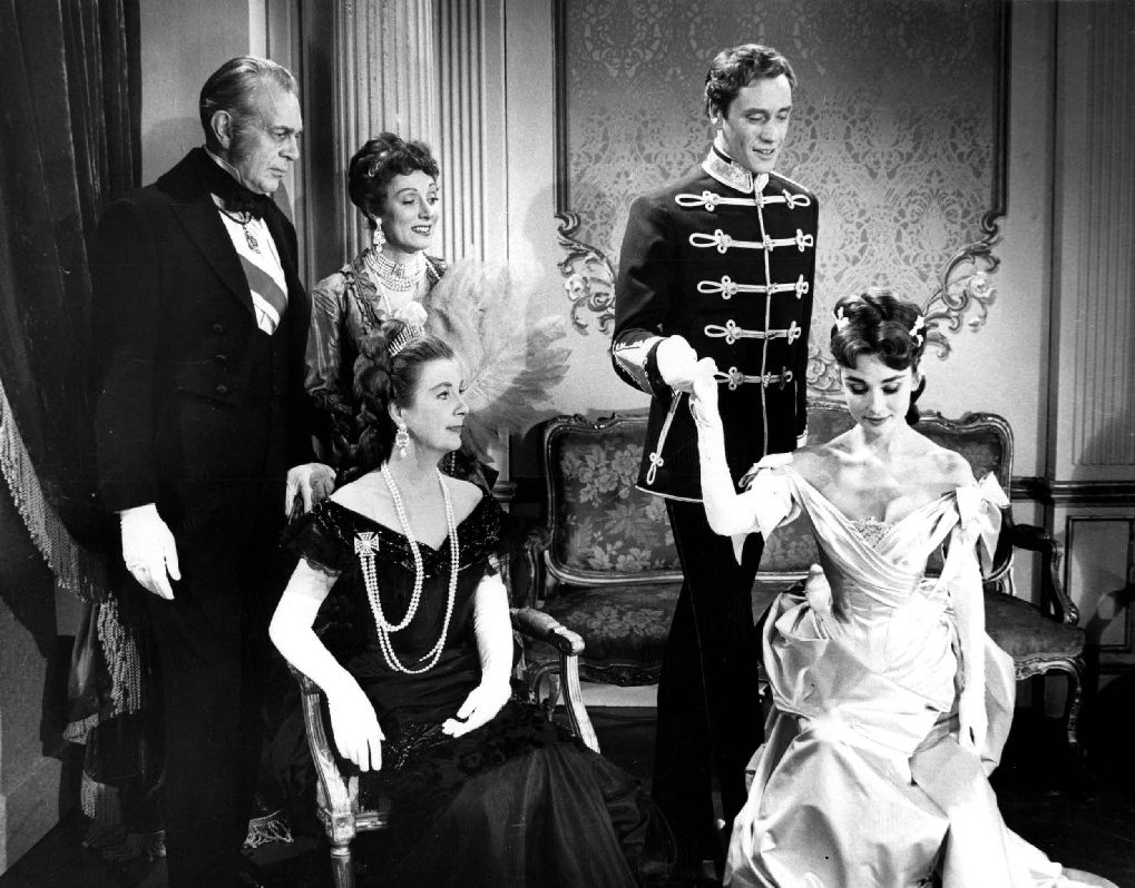 Description: A group of people in formal dress standing around a chair and a man in a uniform and a woman in a dress.