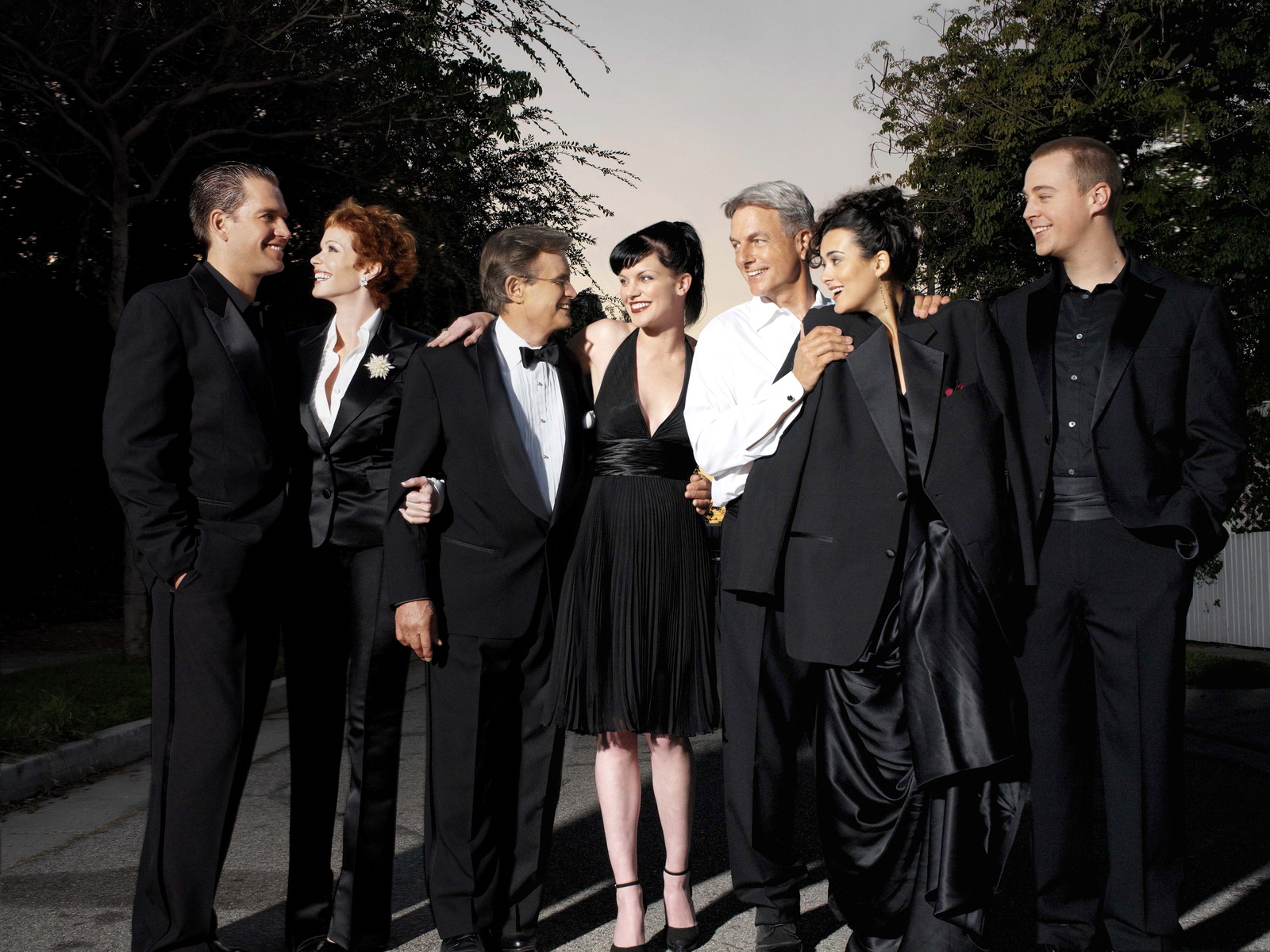 Description: A group of people standing next to each other in formal wear and tuxedos.