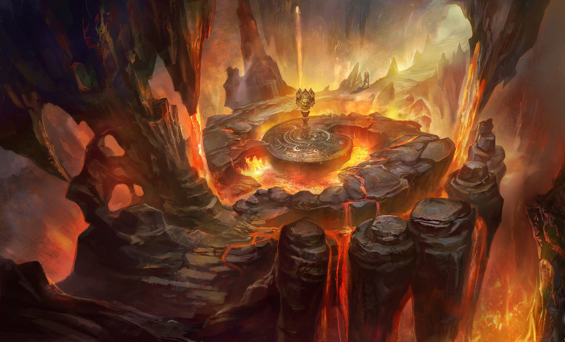Description: A painting of a fountain surrounded by lava and rocks with a fire coming out of it and a man standing on top of it.