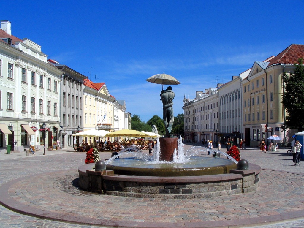 Description: A fountain with a statue of a man holding an umbrella in the middle of a square in a city.
