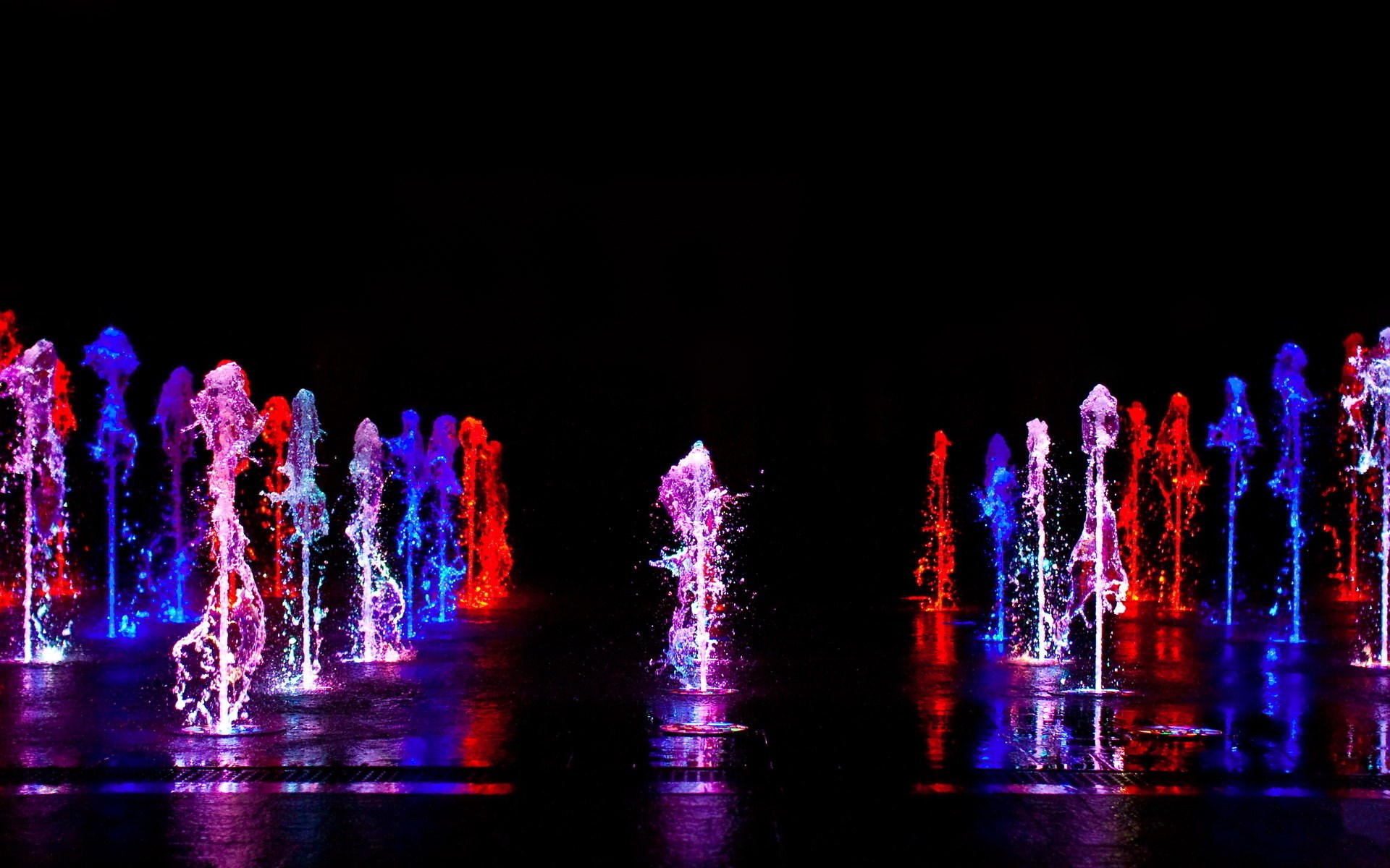 Description: A group of fountains with colored lights on them in a dark room with water spraying from them and a black background.