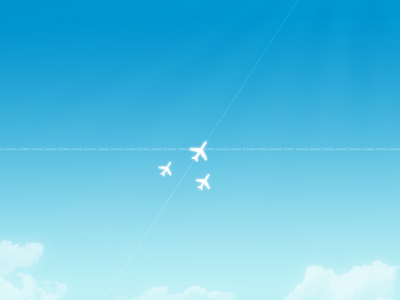 Description: A group of four airplanes flying through a blue sky with white clouds in the background and a line of four planes in the sky.