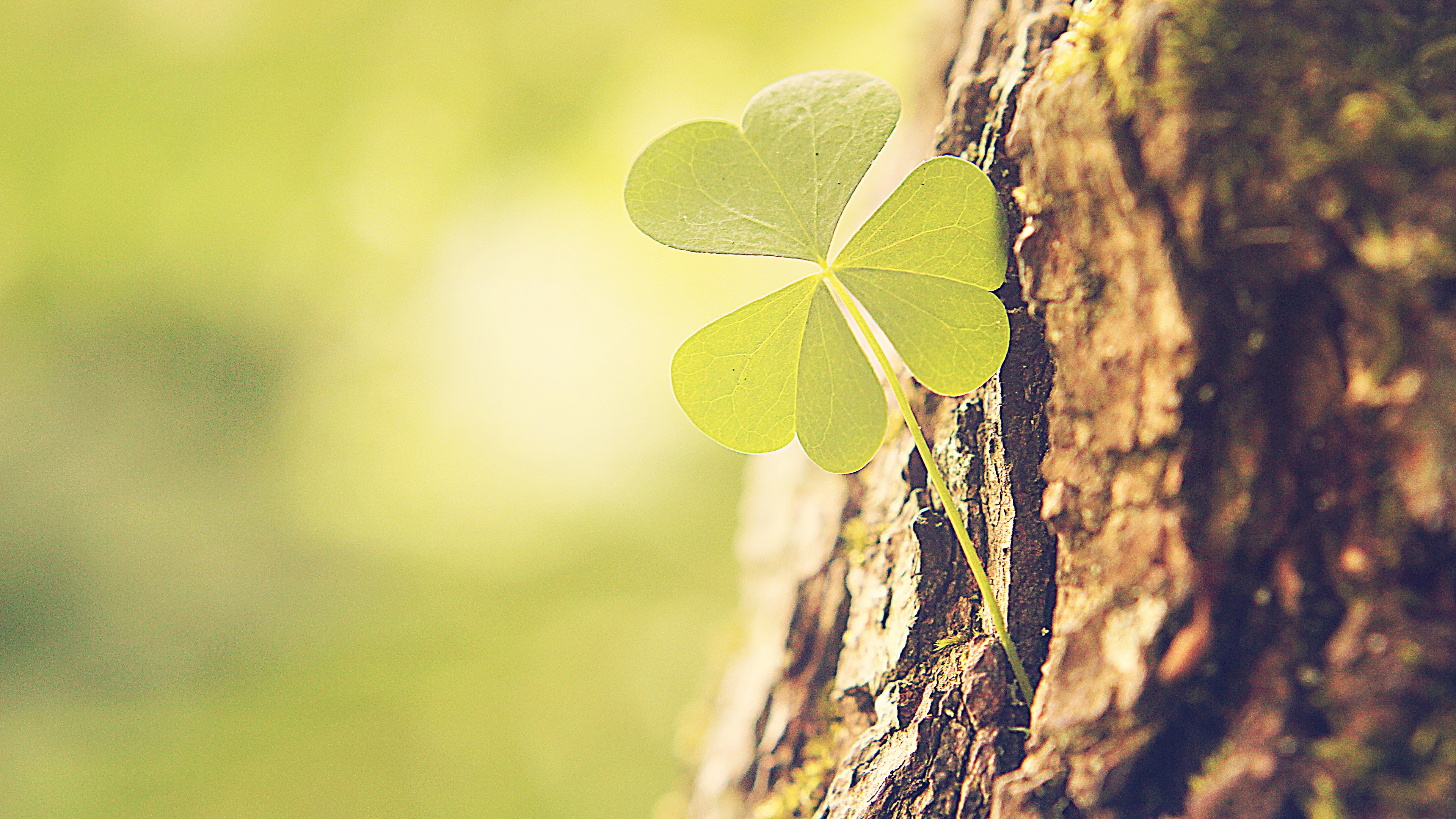 Description: A four leaf clover is growing on a tree trunk in the forest.