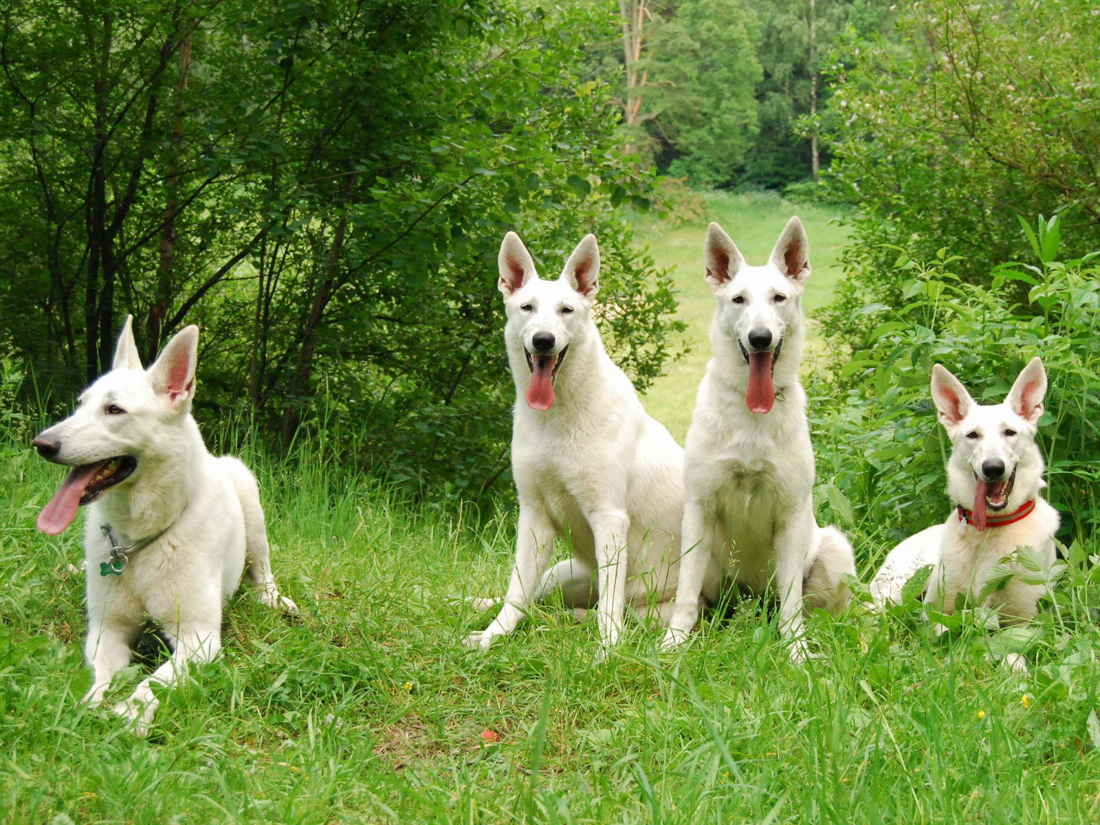 Description: Four white dogs sitting in the grass with their tongue out and their tongue out.