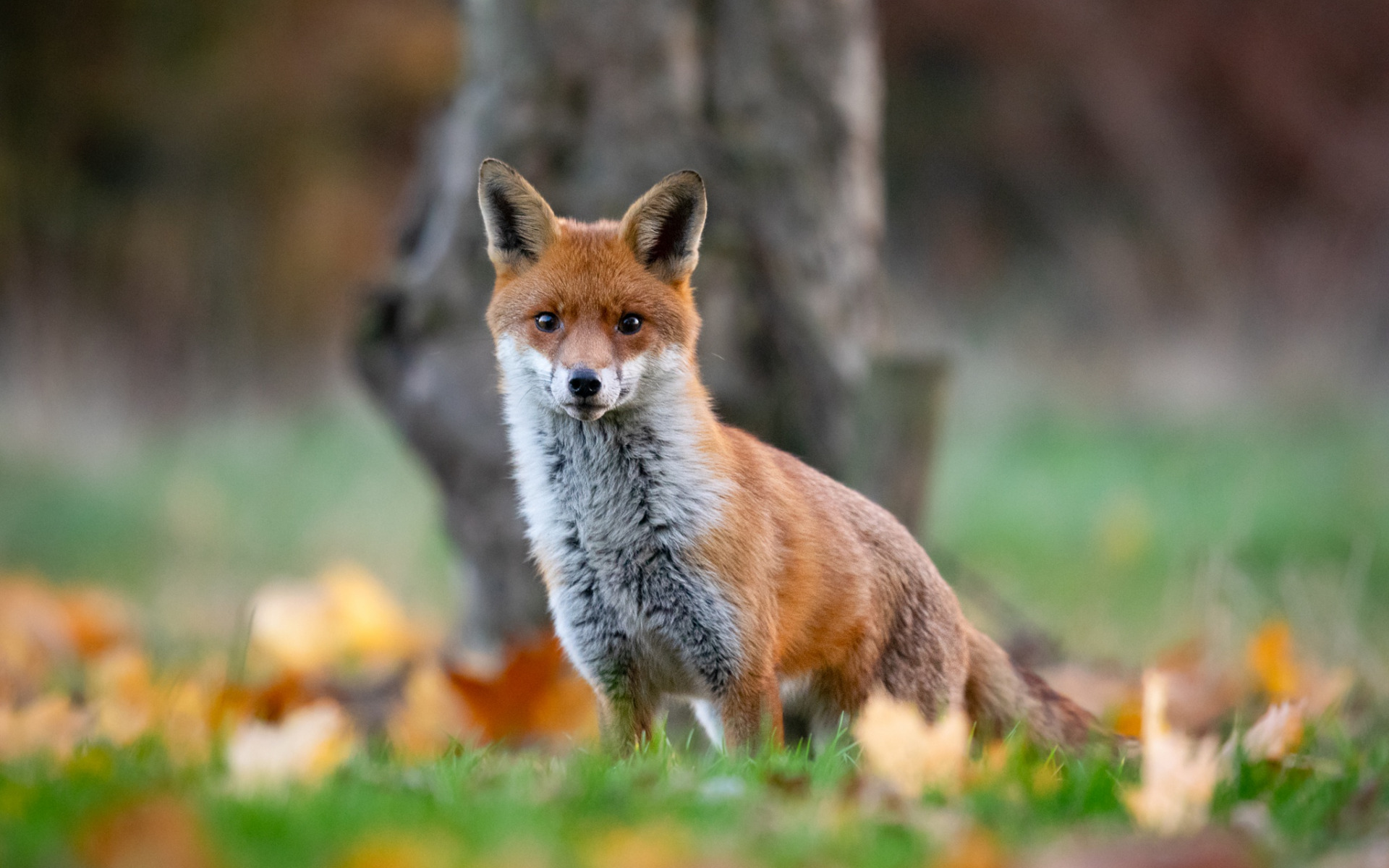 Description: A fox standing in the grass next to a tree with leaves on it's ground and a tree in the background.