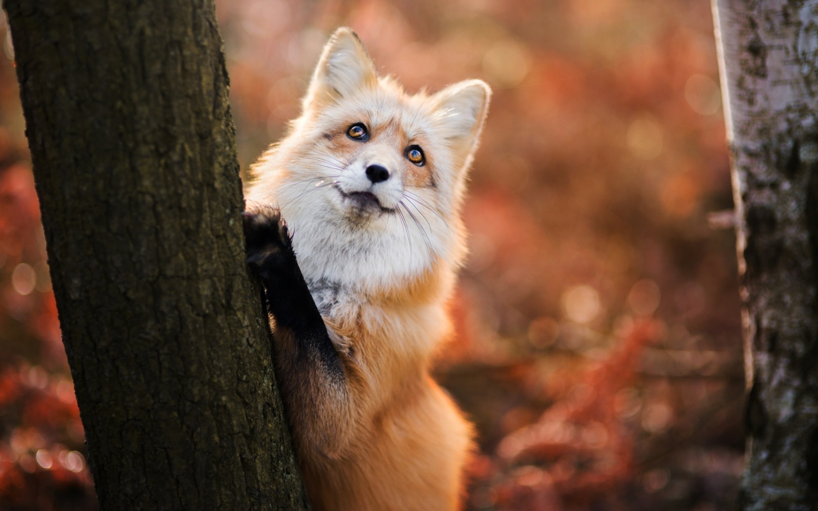 Description: A fox is peeking out from behind a tree trunk in the woods.