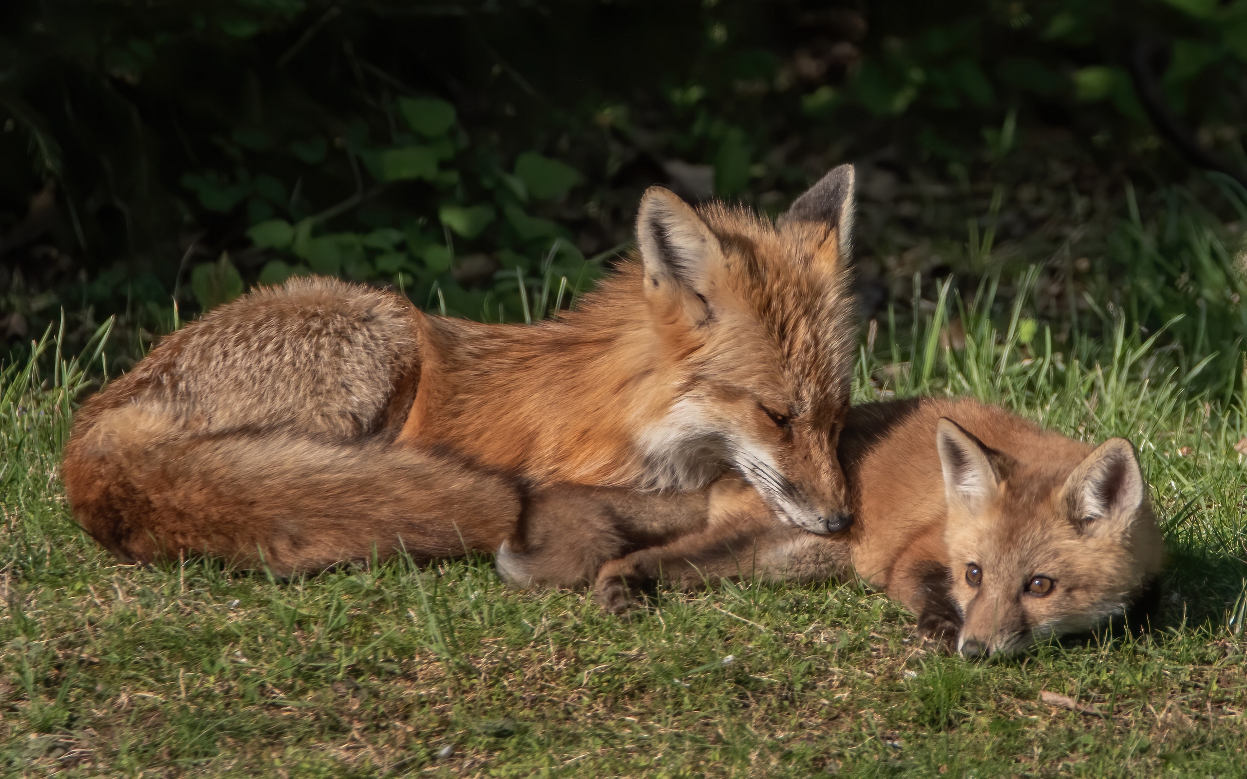 Description: A couple of foxes laying on top of a lush green field of grass next to a forest filled with trees.