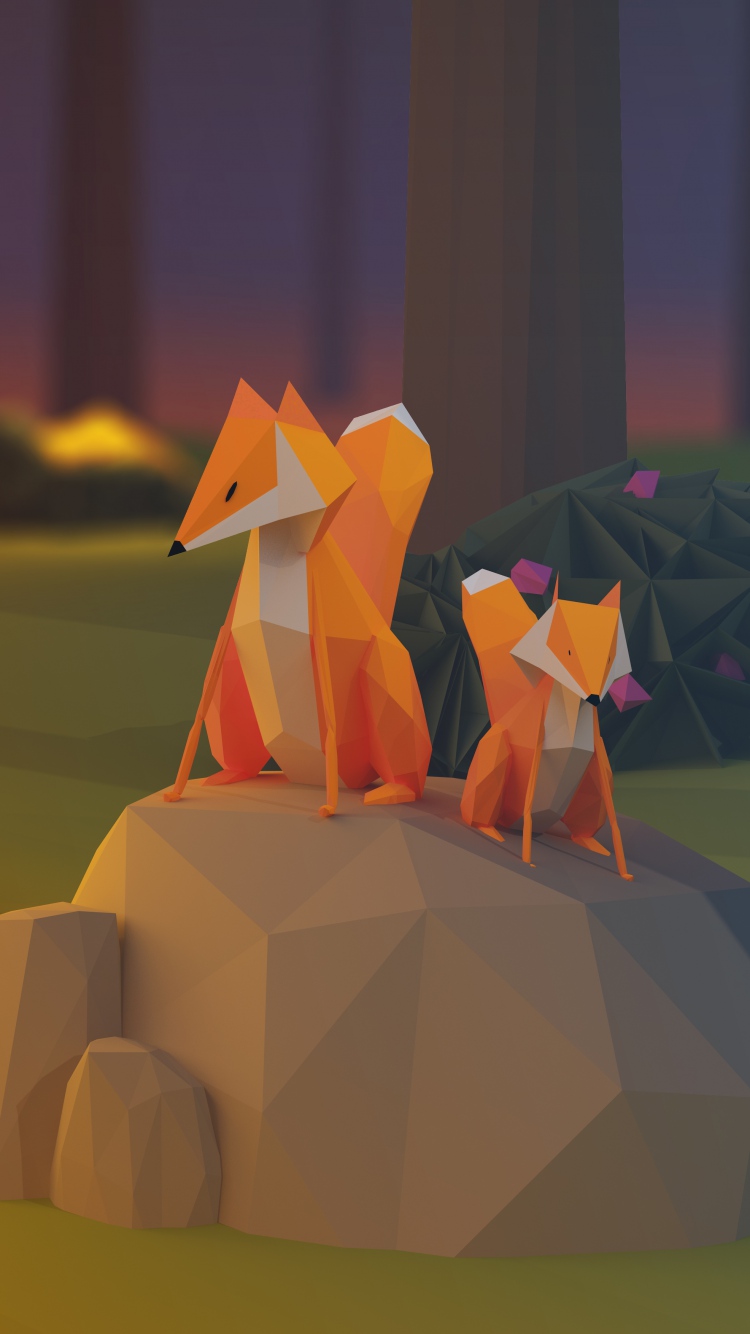 Description: A group of foxes sitting on top of a rock in a forest at night time with a full moon in the background.