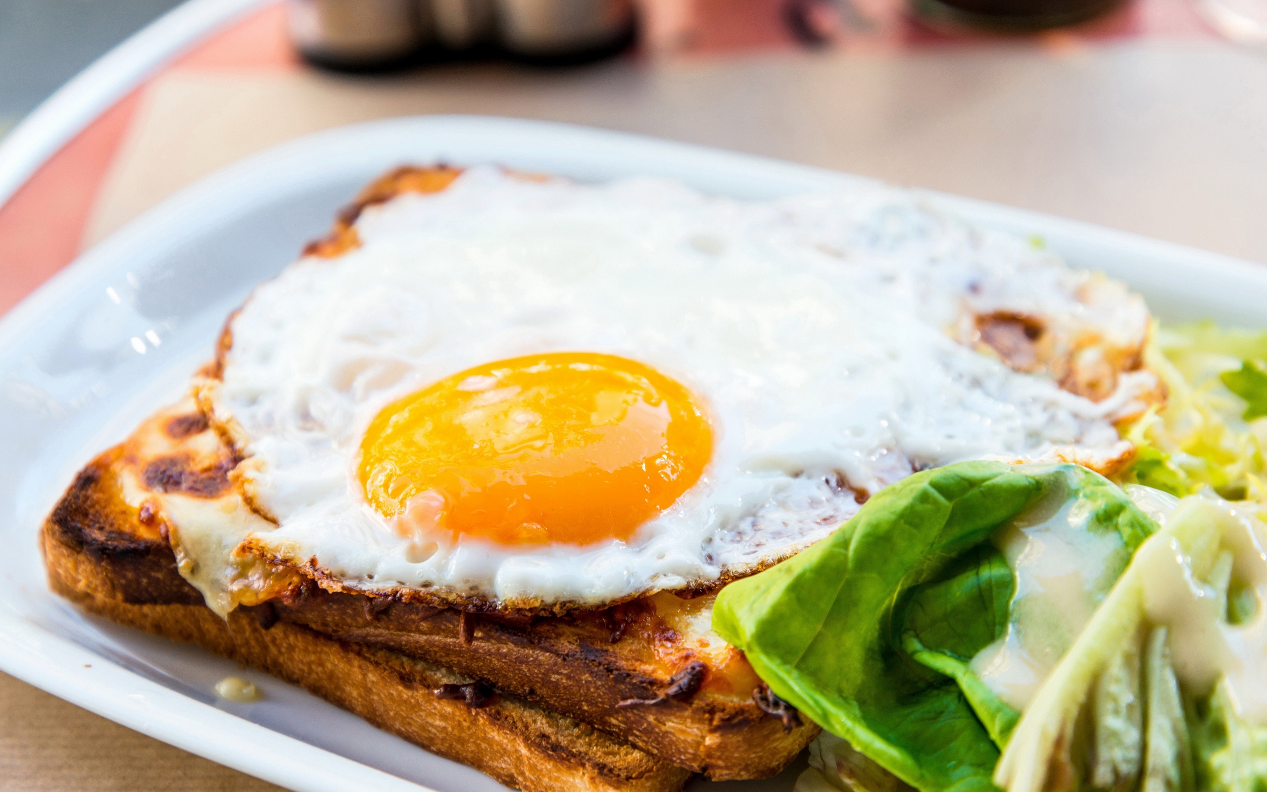 Description: A plate of food with a fried egg on top of toast and salad on the side of the plate.