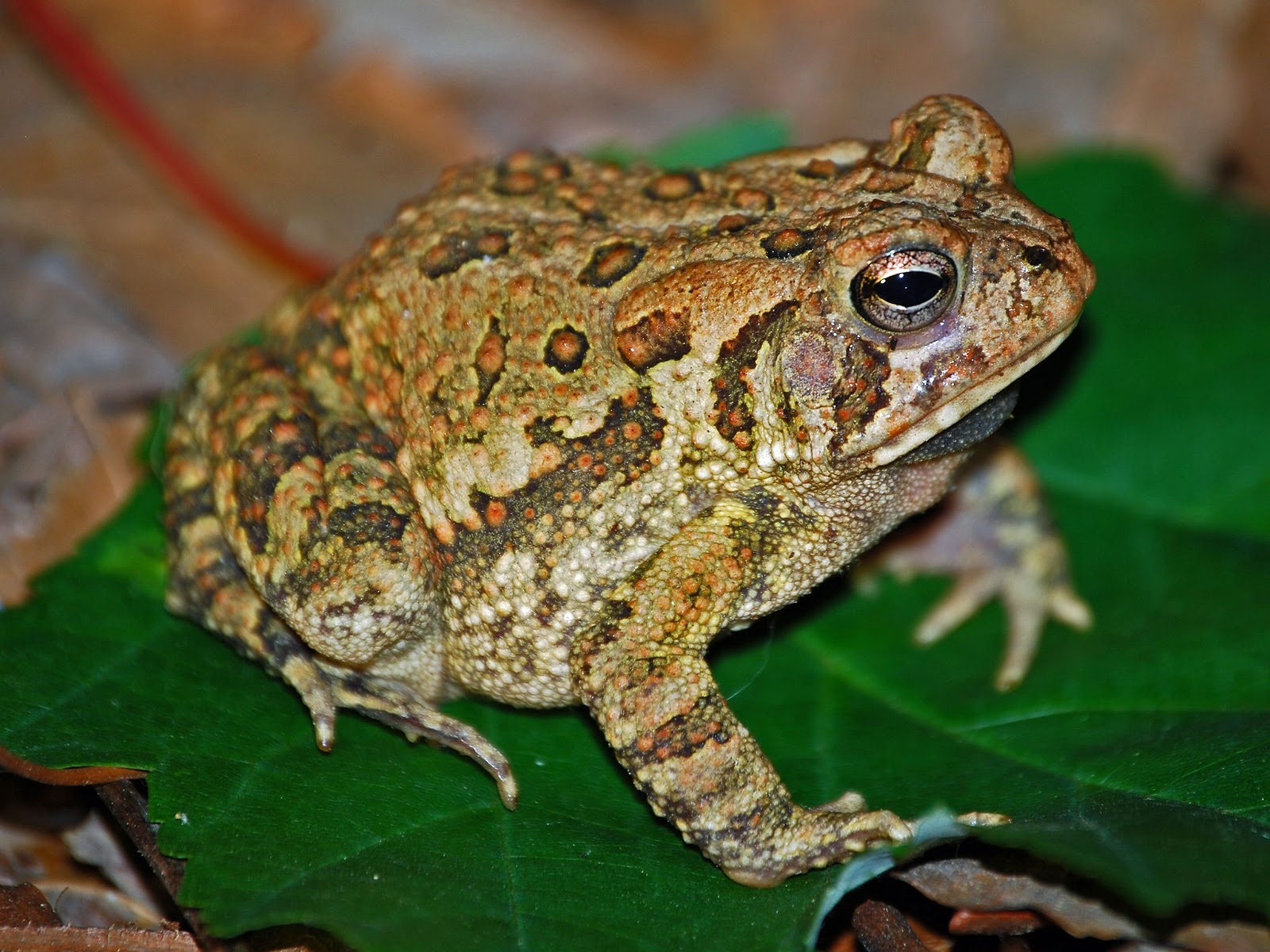 Description: A frog sitting on a green leaf on the ground with leaves around it and a blurry background of leaves.