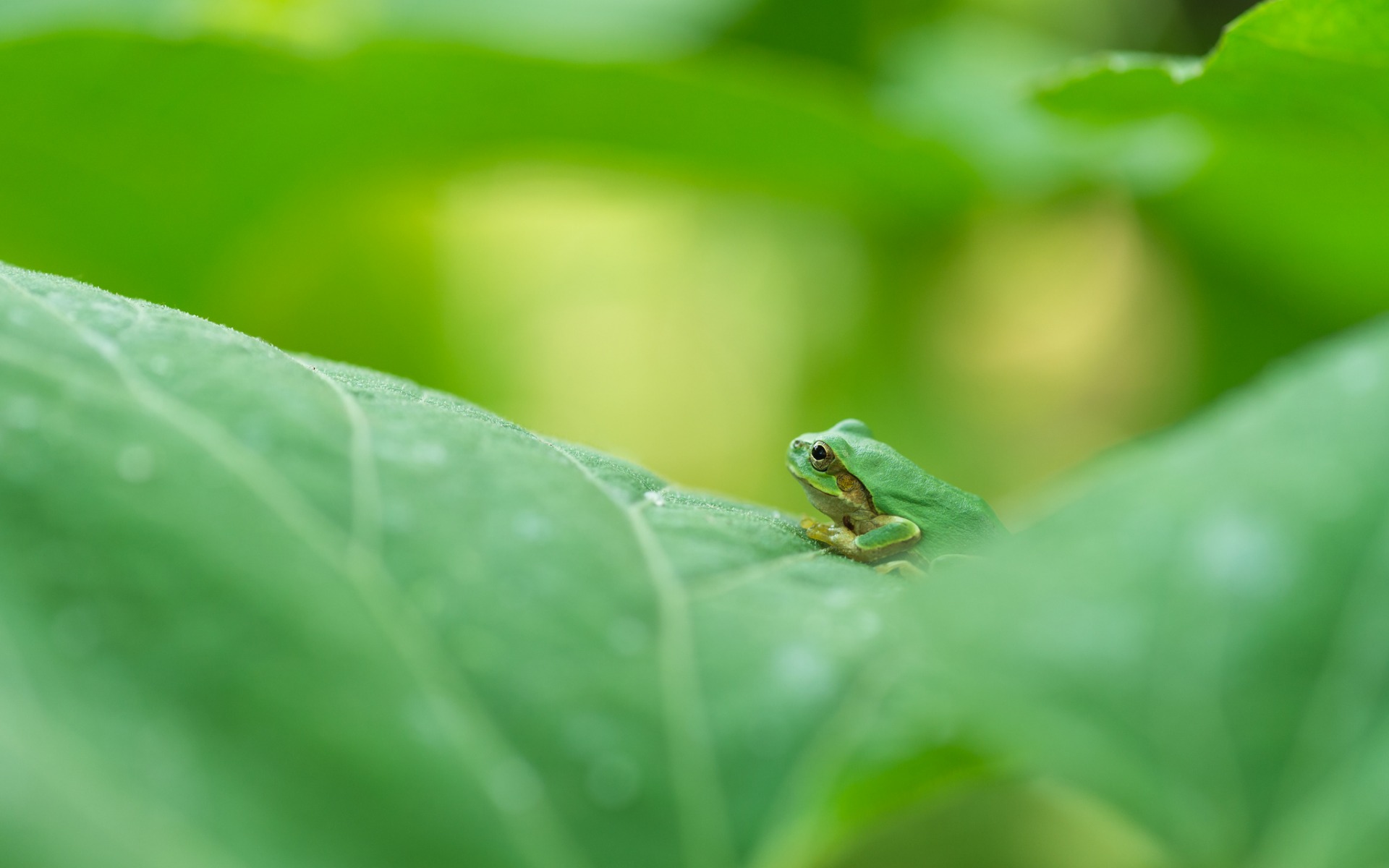 Description: A frog sitting on a leaf in the rain with water droplets on it's back legs and head.