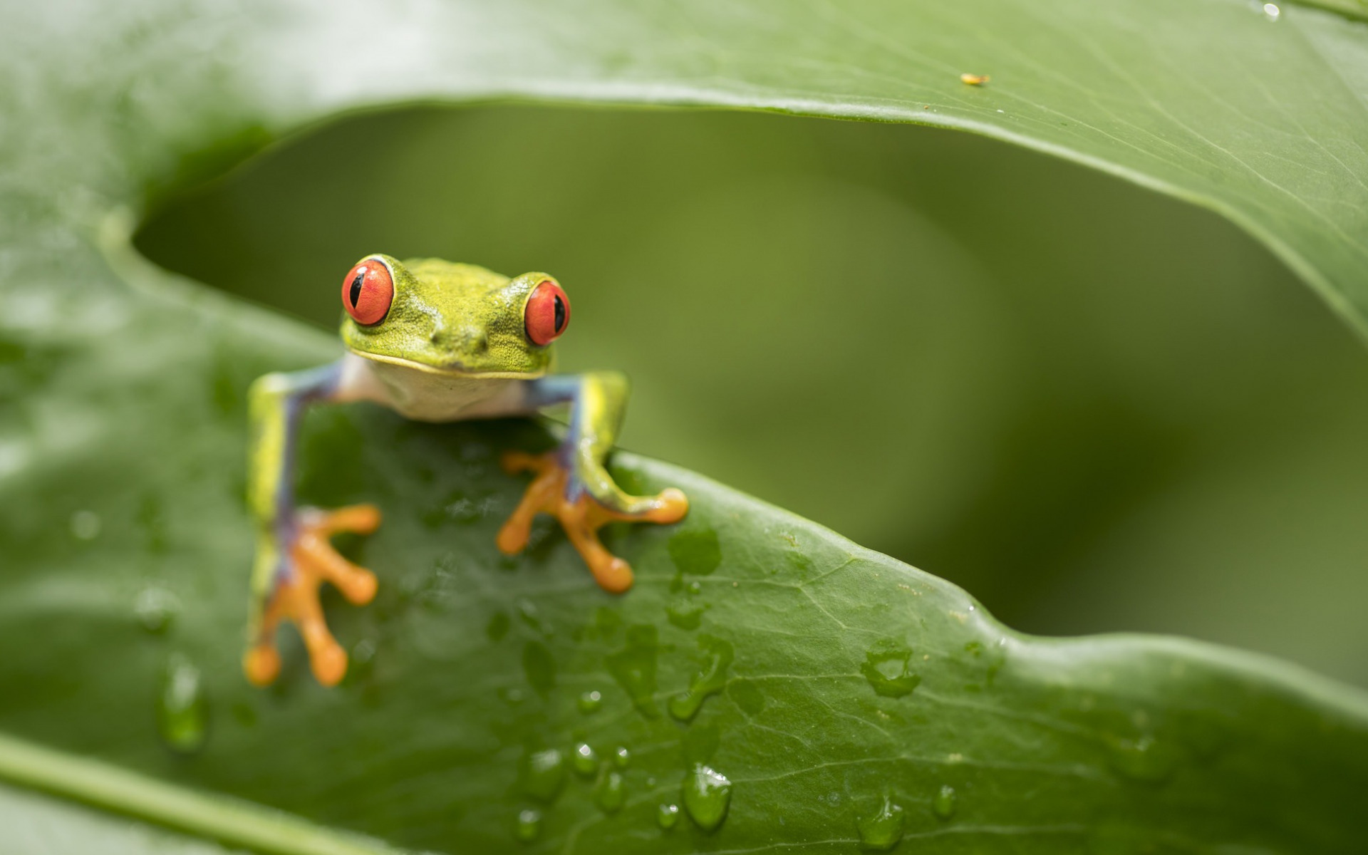 Description: A frog with red eyes sitting on a leaf with drops of water on it's surface and a green background.