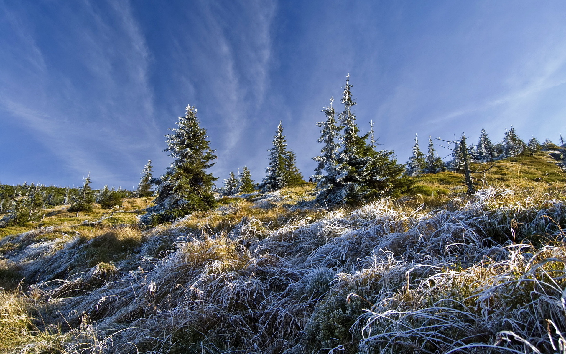 Description: A field with trees and grass covered in frost and ice on a sunny day with a blue sky above.