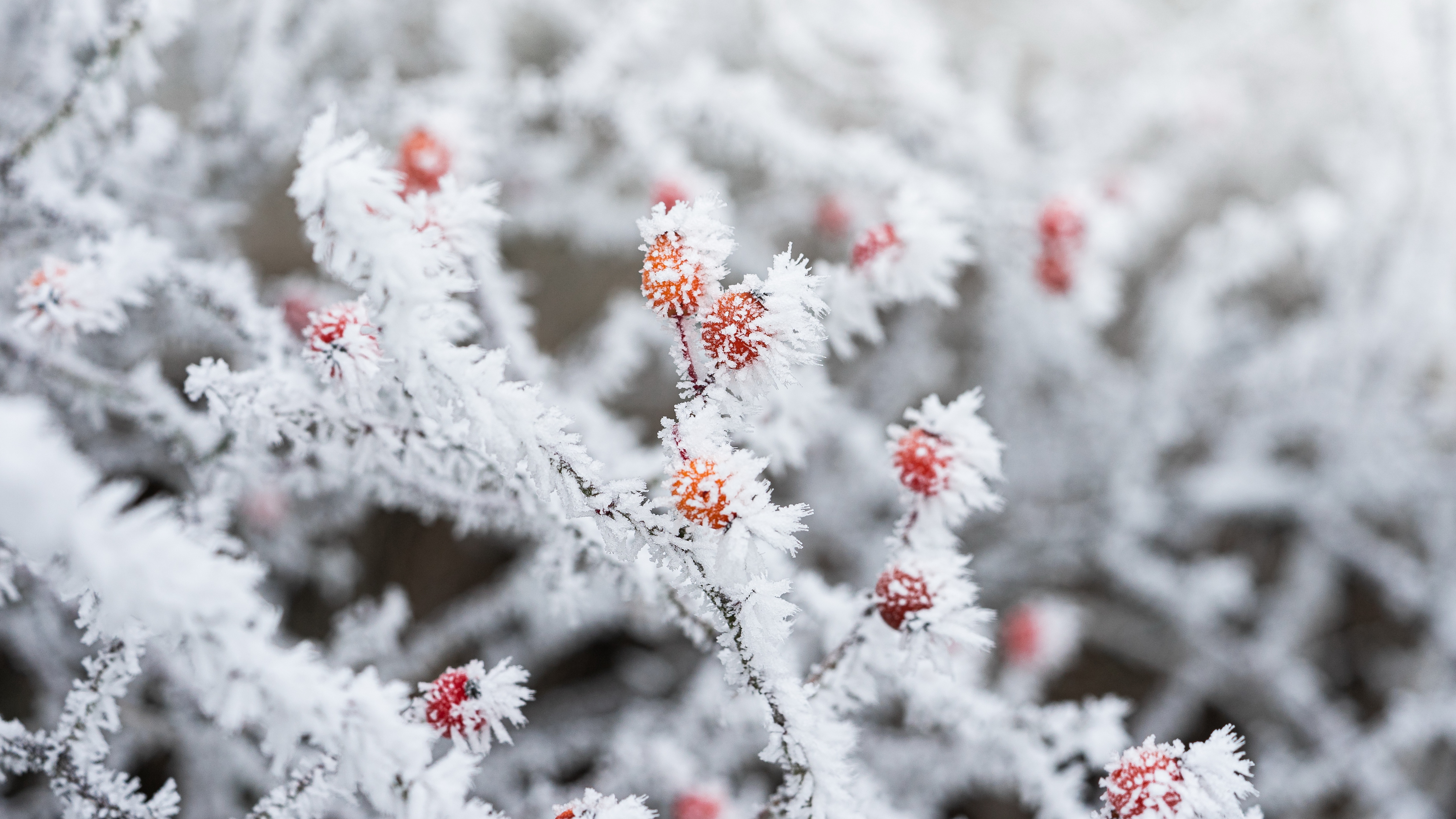 Description: A close up of a plant with frost on it's branches and berries on the branches of the plant.