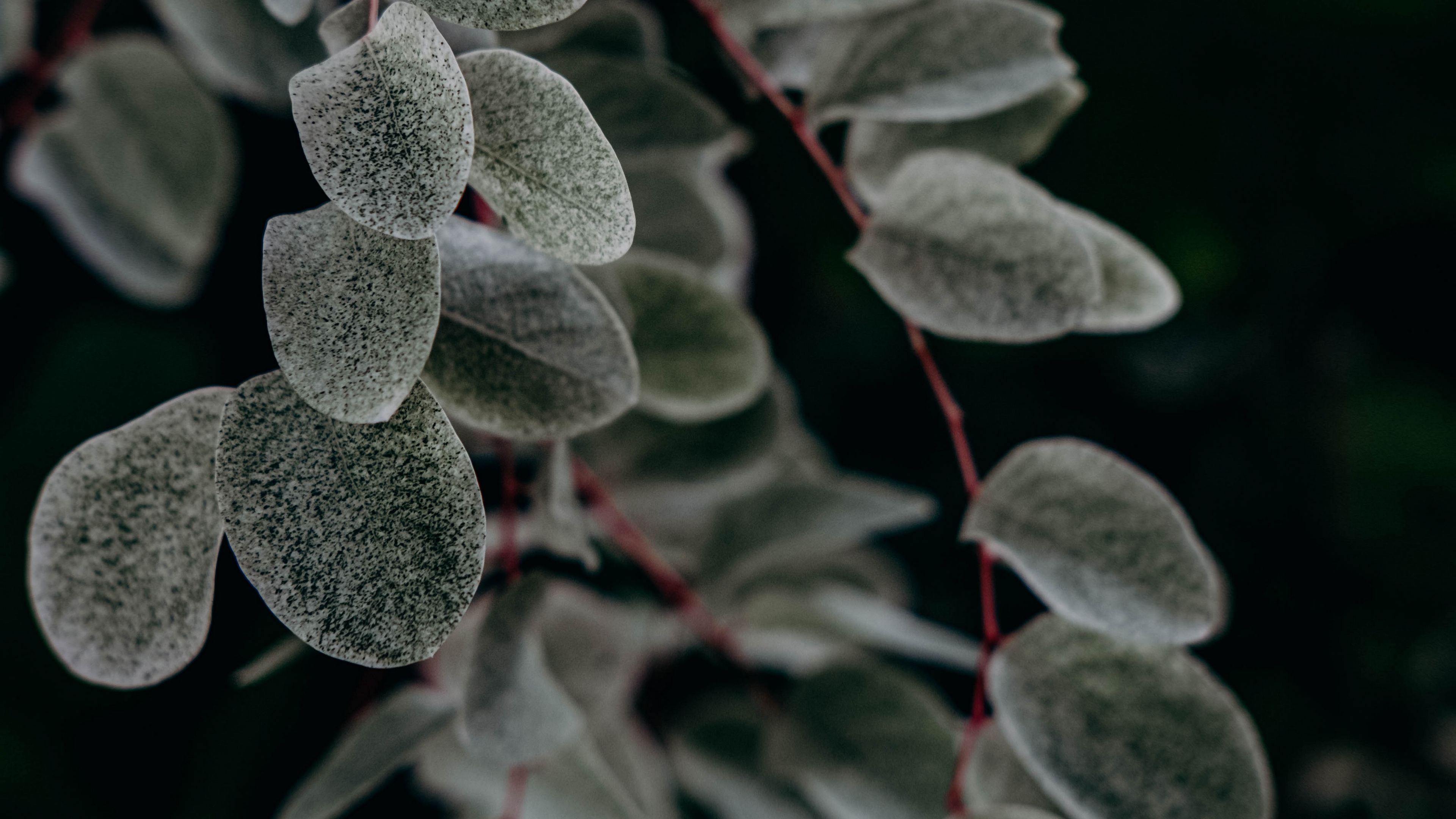 Description: A close up of a plant with frost on it's leaves and stems with red stems in the foreground.