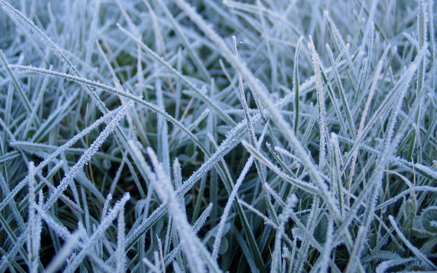 Description: A close up of a grass covered in frosty grass blades and grass stems with small drops of dew.