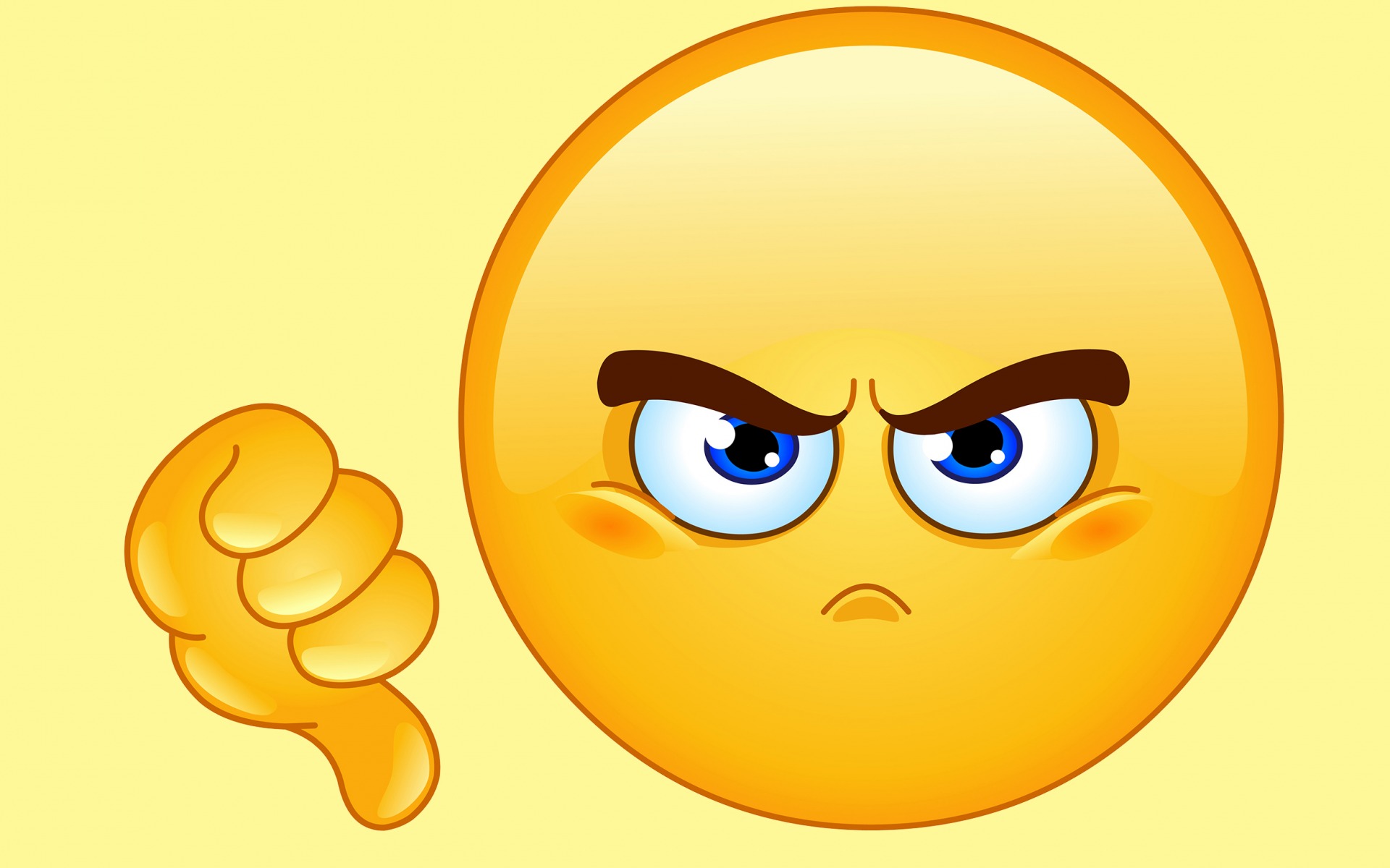 Description: A yellow emotiction with a frowning face and a fist up in the air with a yellow background.