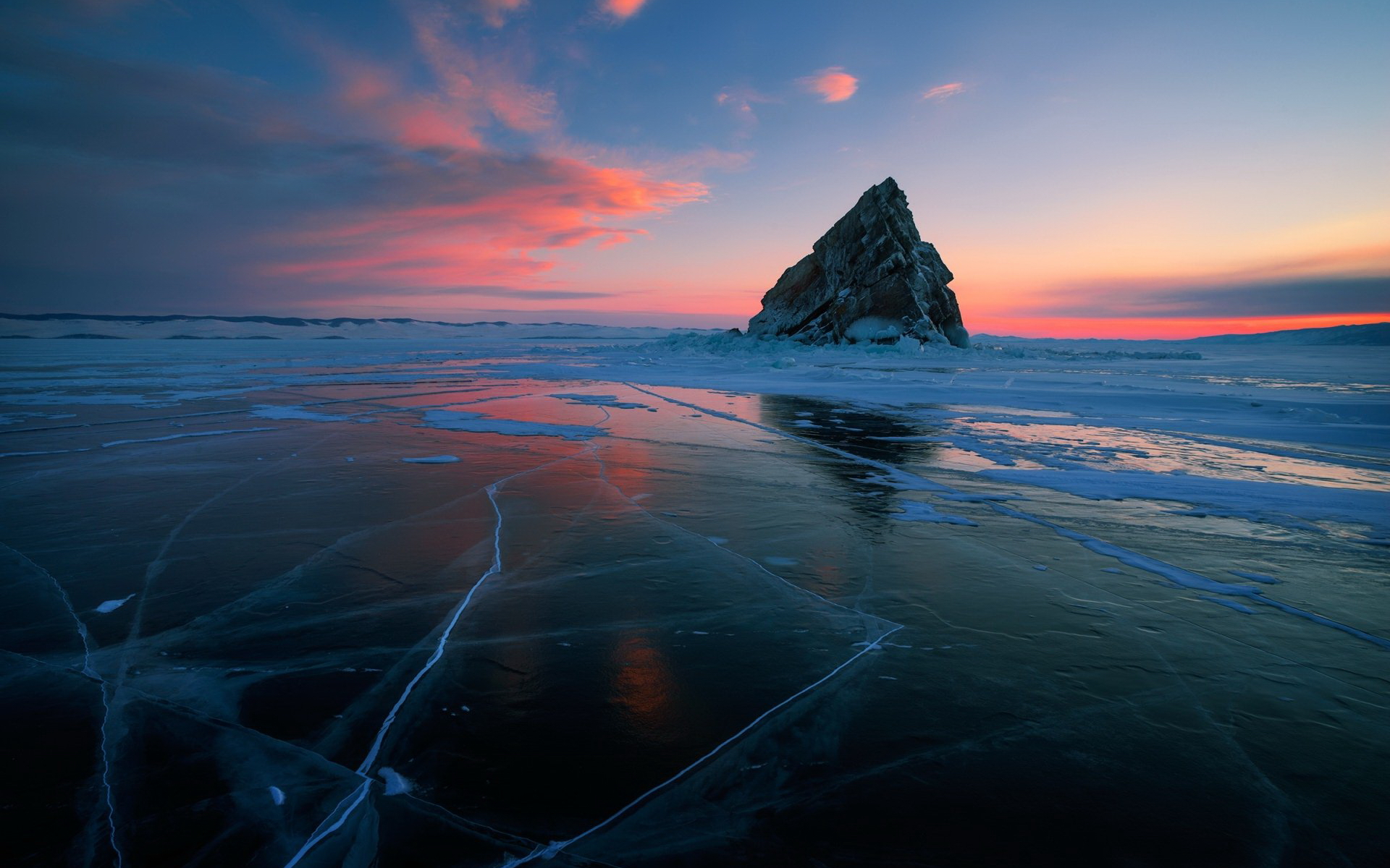 Description: A rock formation in the middle of a frozen lake at sunset with a pink sky in the background and ice floes.