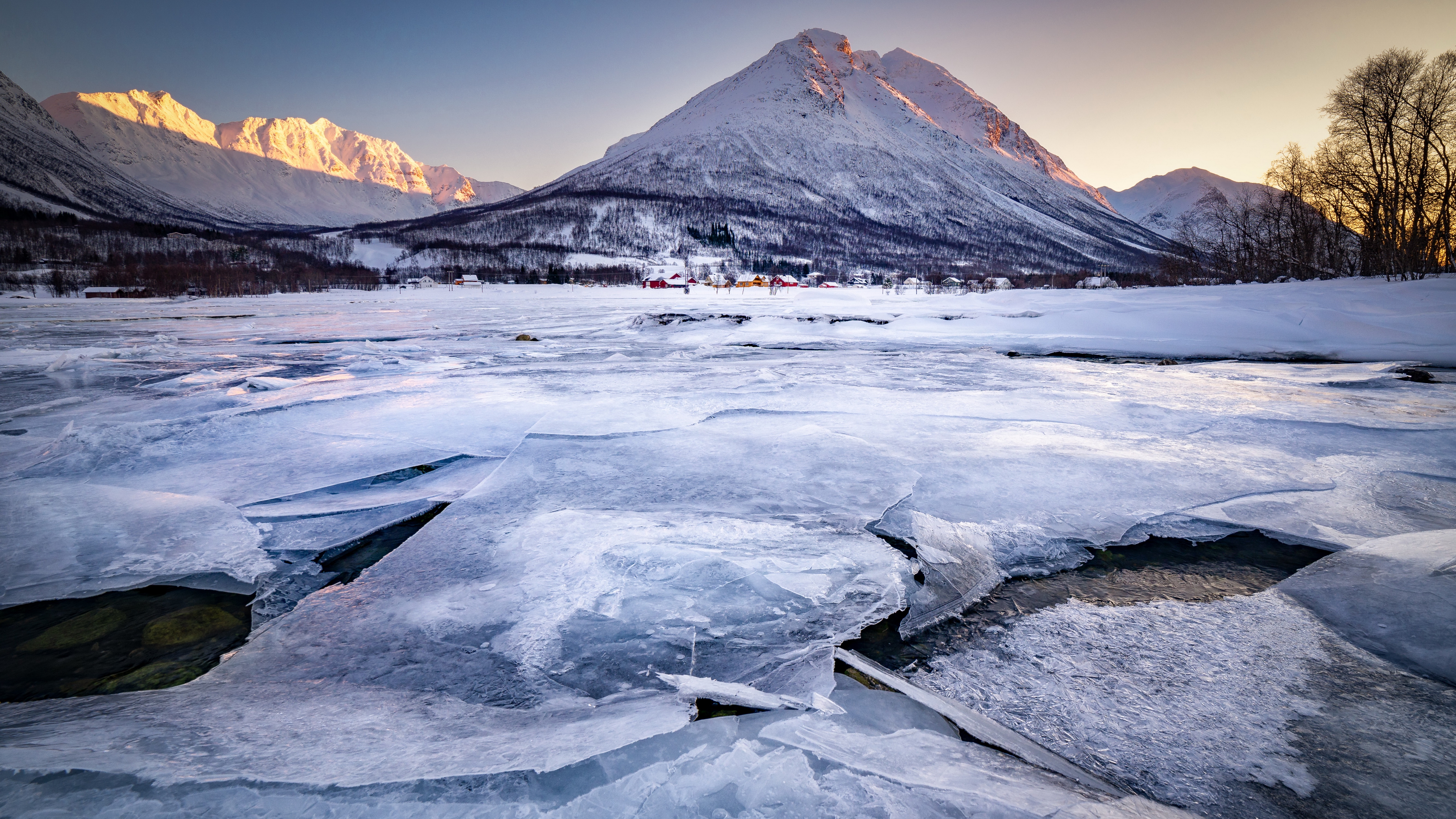 Description: A frozen river with mountains in the background at sunset or dawn with a small cabin in the distance in the foreground.