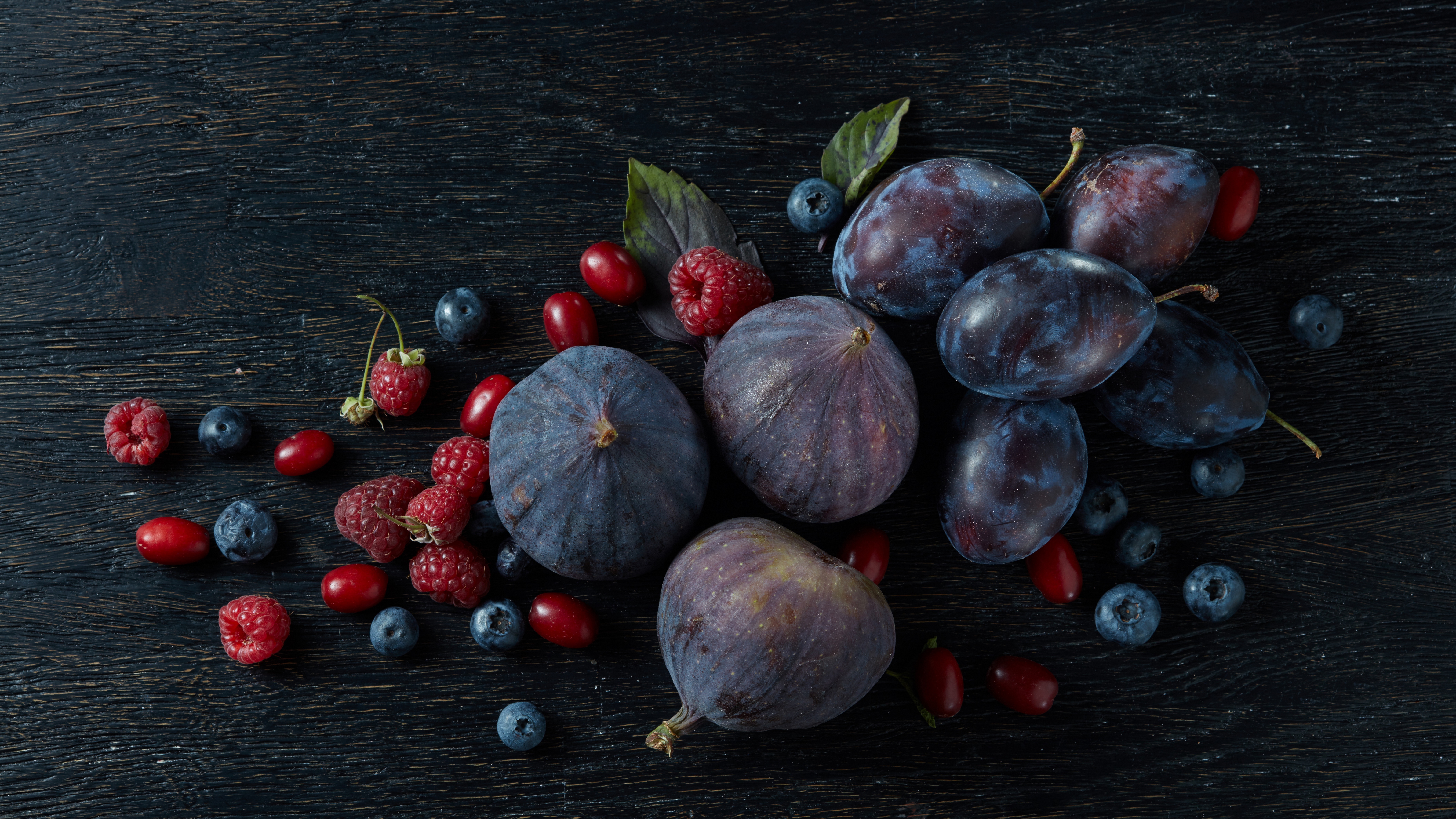 Description: A bunch of fruit sitting on top of a wooden table next to berries and a leafy green leaf.
