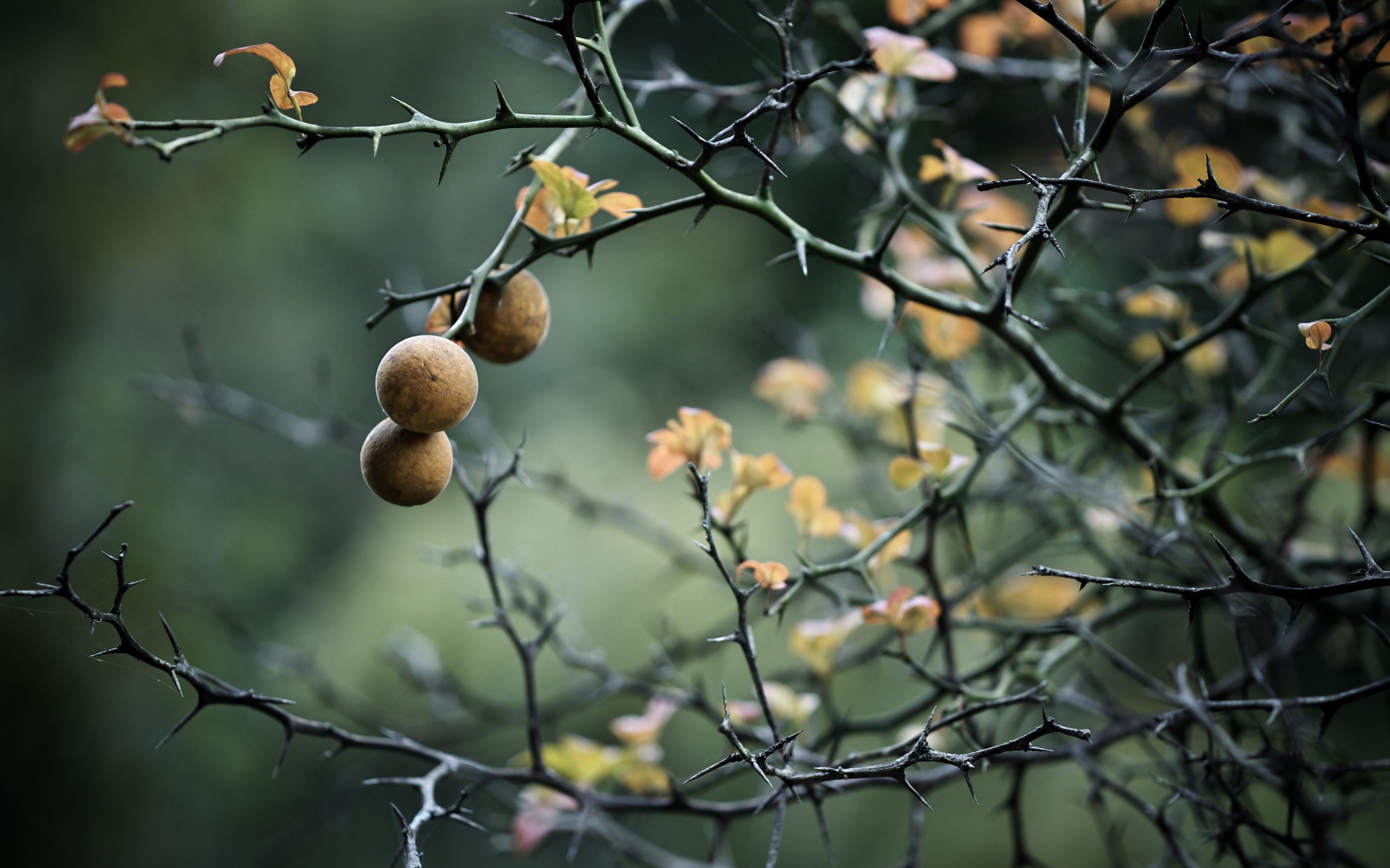 Description: A couple of fruit hanging from a tree branch with leaves on it's branches and a blurry background.