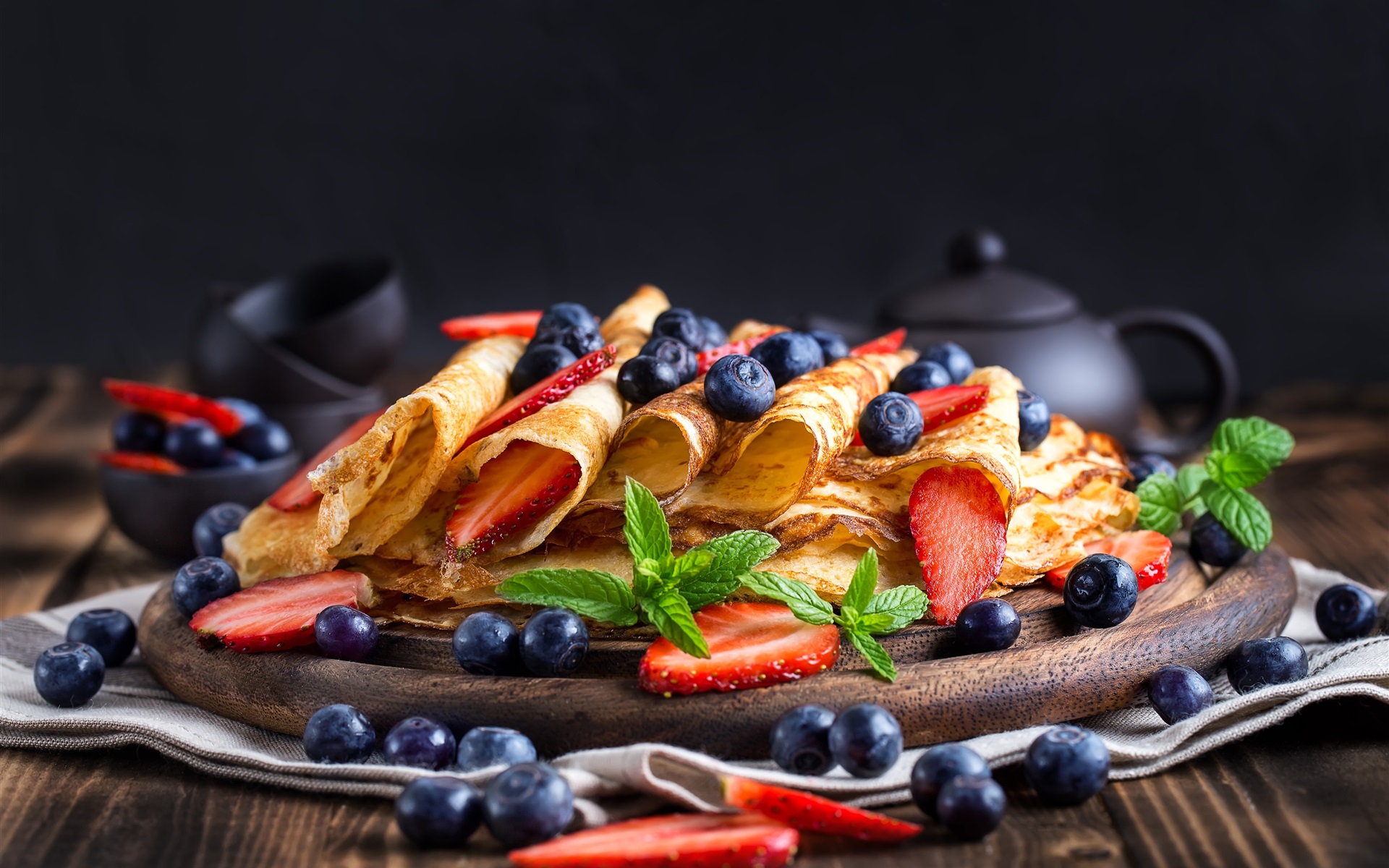 Description: A plate of fruit and pastry on a wooden table with a teapot and teacups in the background.