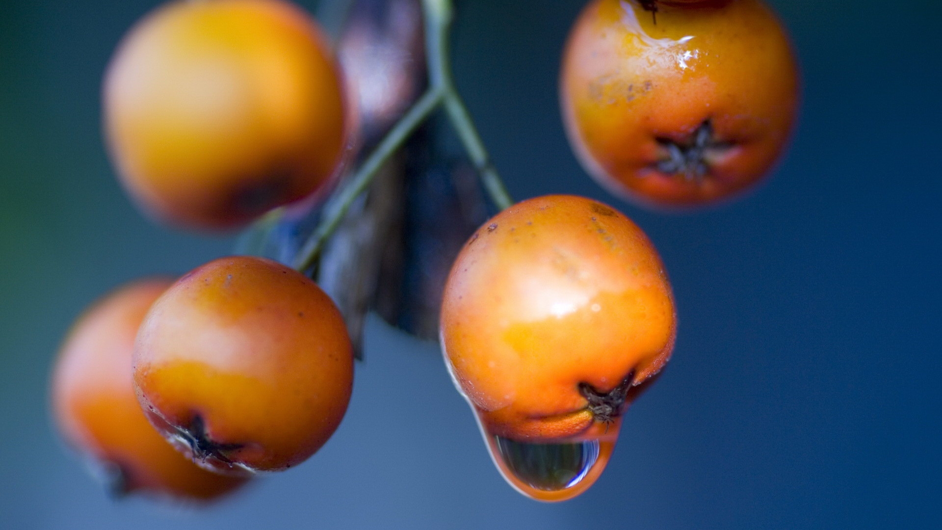 Description: A bunch of fruit hanging from a tree branch with water droplets on it's leaves and stems.