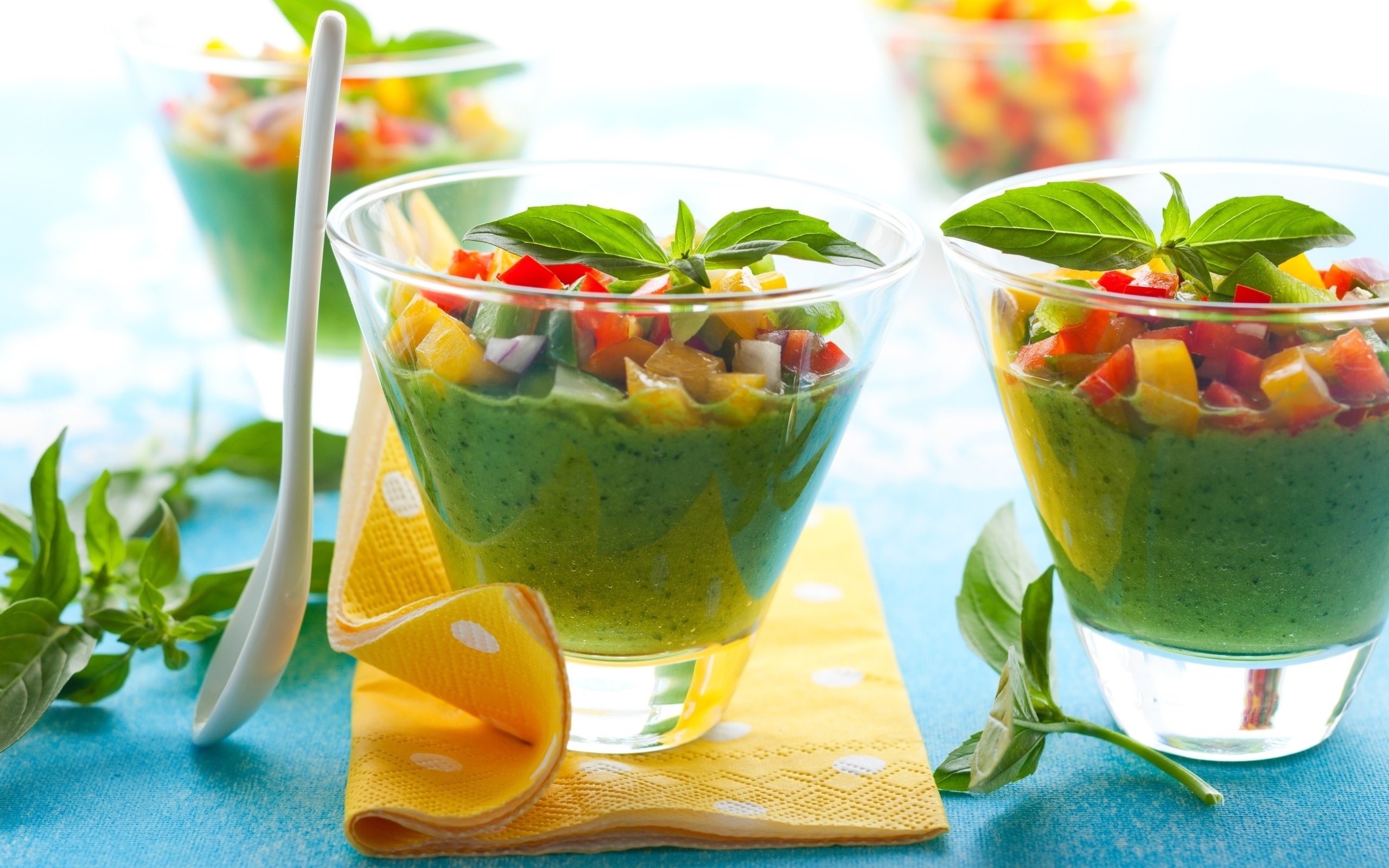 Description: A table topped with two cups filled with fruit and veggies next to a spoon and a napkin.
