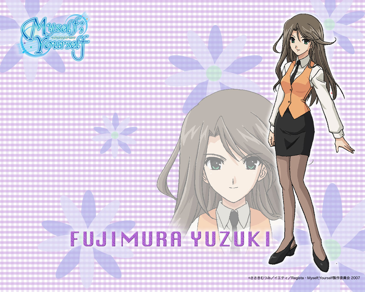 Description: A girl in a short skirt and a shirt with a tie on her head and a flower background with the words fujiuma yu.