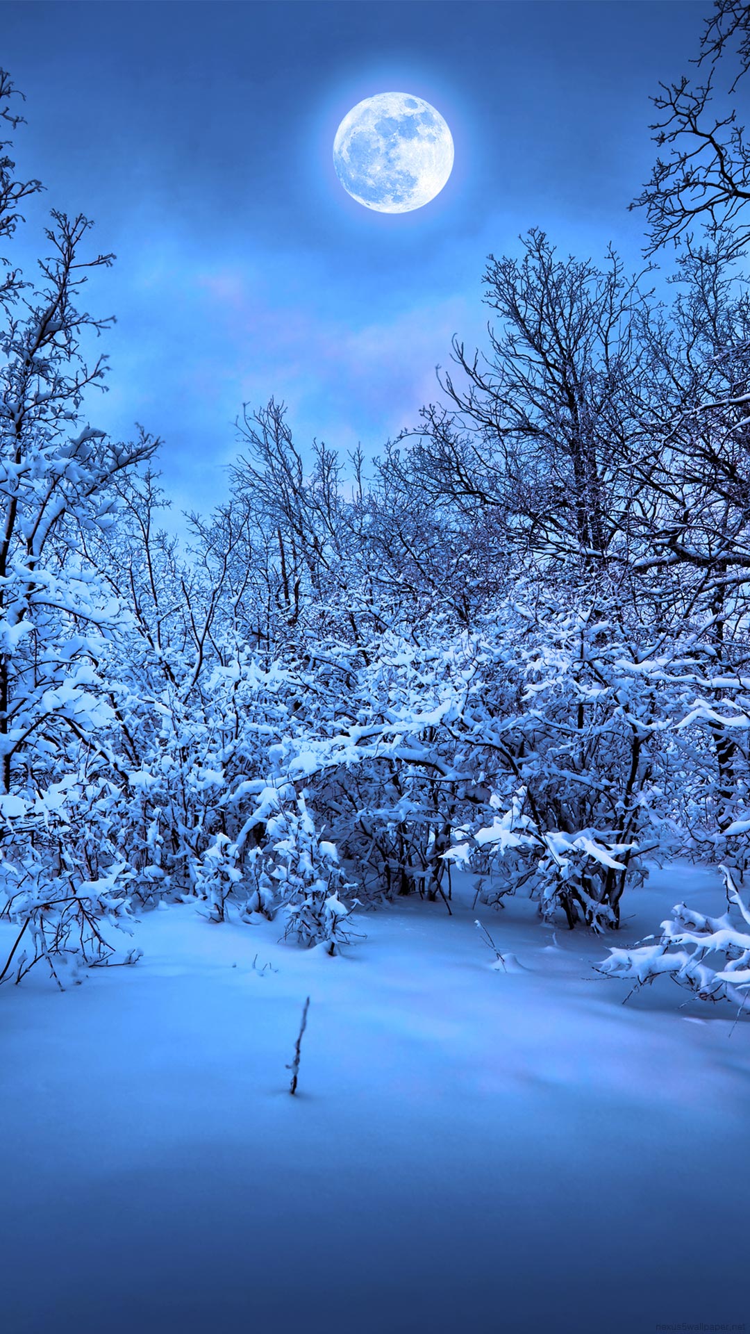 Description: A full moon is seen over a snowy forest with trees and bushes in the foreground and a blue sky with clouds.