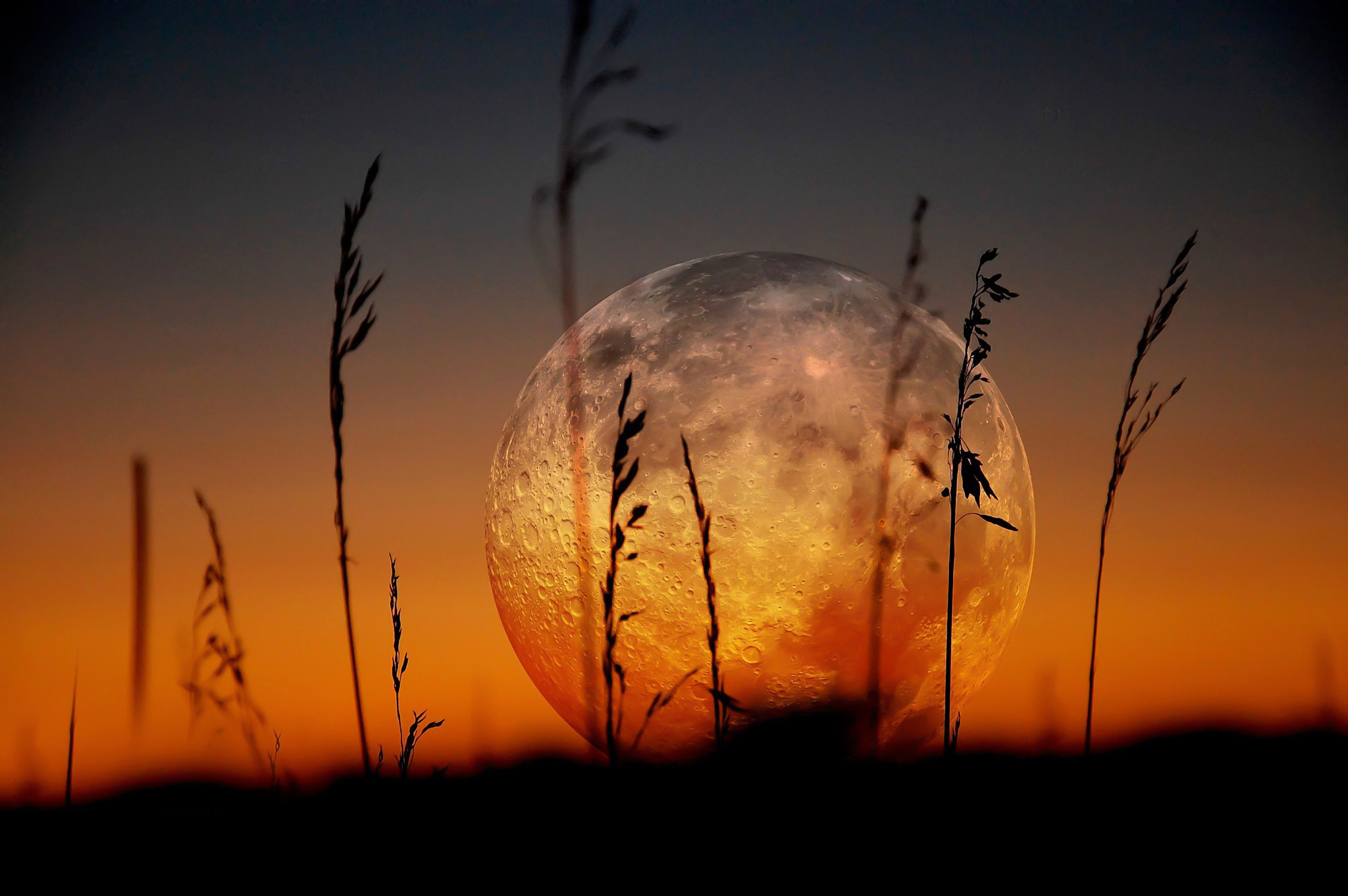 Description: A full moon is seen through the grass at sunset in the background is a silhouette of a tree and a building.