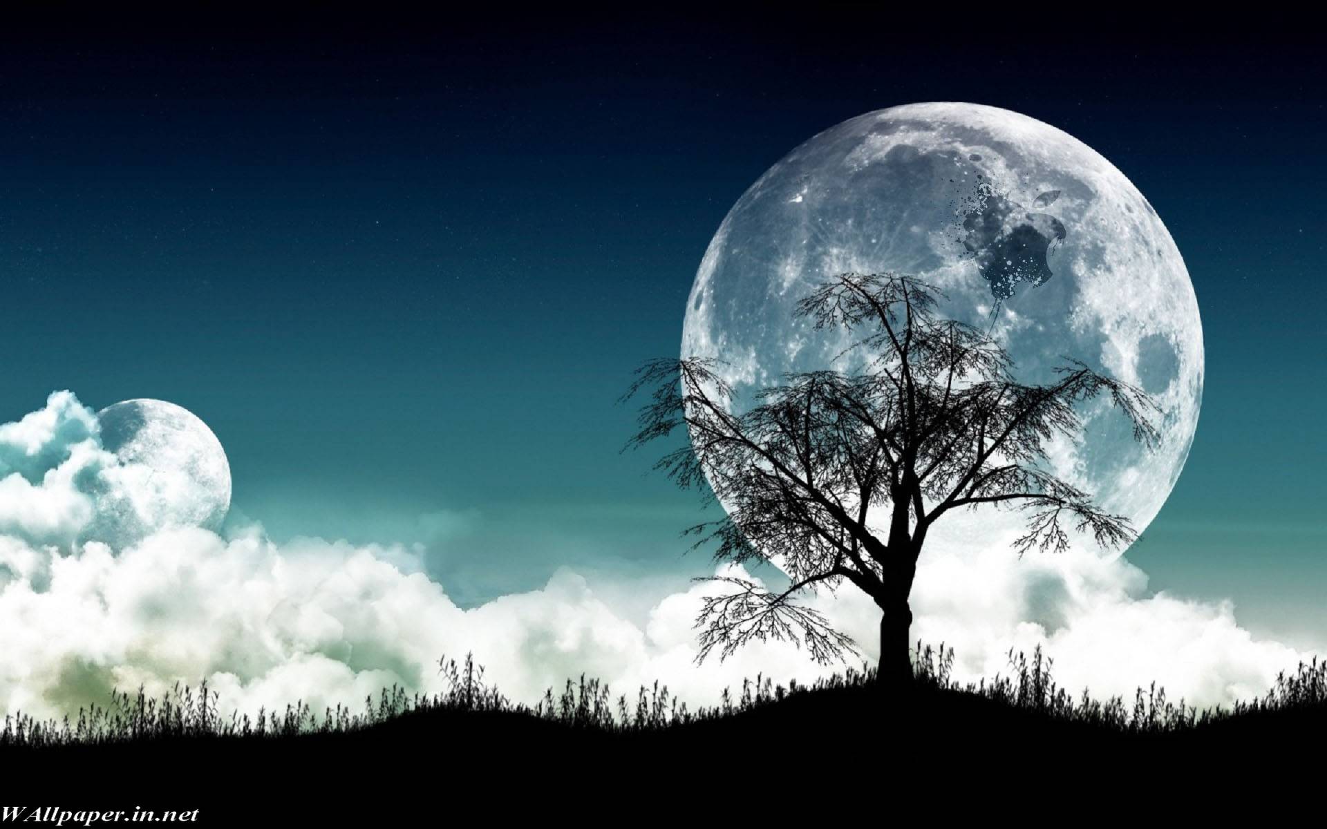 Description: A full moon is seen above a tree in the sky with clouds and grass below it.